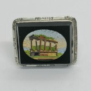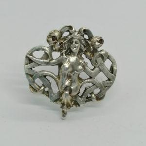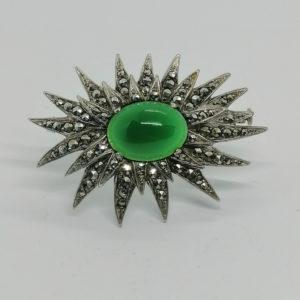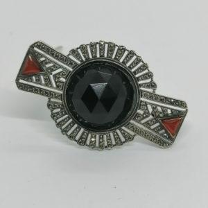 Broche argent, de forme très géométrique, ajourée, cabochon de verre facetté, pavage marcasites, 1930, Art Déco. 400,00€