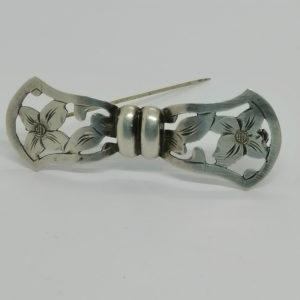 Broche argent, façon noeud ajouré et motif floral, vers 1925-30.