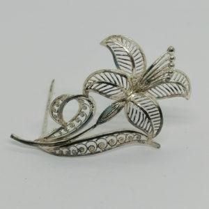 Broche argent, fleur stylisée, ajourée et un peu de filigrané, 1960-80.