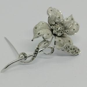 Broche argent, fleur avec sertie de pierres blanches, lisse et matifié.