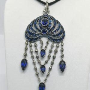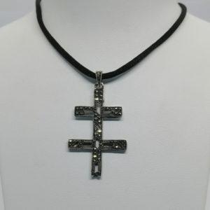 Pendentif argent, de forme structuré, pavage marcasites, au centre un cabochon d’onyx, Art Déco. 170,00€ Vendu