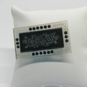 • Broche en plexis noir et transparent, et décor de fleurs, vers 1900-25