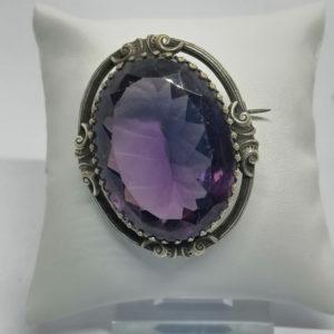 • Broche en métal blanc, et importante pierre en verre facettée de couleur améthyste, vers 1880-1900.