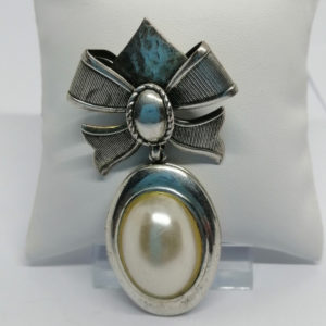 • Broche en métal blanc, et pampille perle d’imitation, ouvrante, 1980-90.
