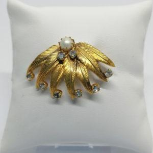 • Broche en plaqué or, façon feuilles de palmier, strass et perle d’imitation, vers 1940-50.