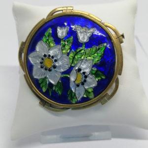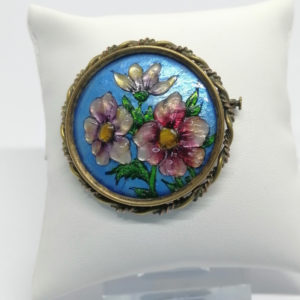 Broche laiton jaune, émail sur cuivre, motif floral, Limoges, 1900-20.