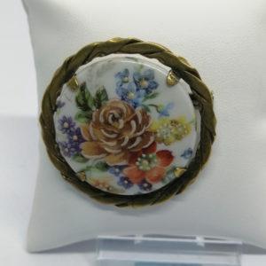 Broche laiton jaune, et porcelaine avec fleurs, vers 1920.