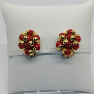 Boucles d’oreilles, clip, avec boule en verre rouge et couleur or, 1940-50.