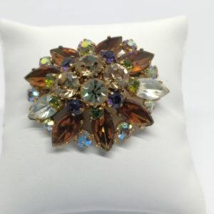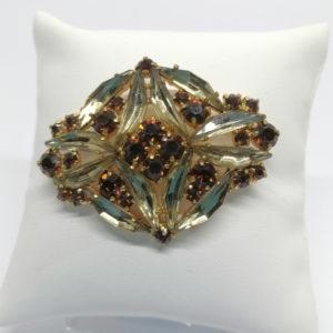 Broche ajourée, avec pavage de strass en navettes et rond, brun et ambré, vers 1940-50.