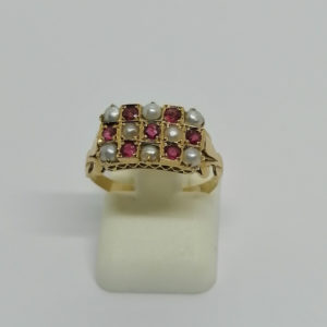 Bague or rosé, façon damier, avec pierre rouge et demi-perles fines, vers 1900.
