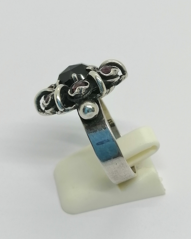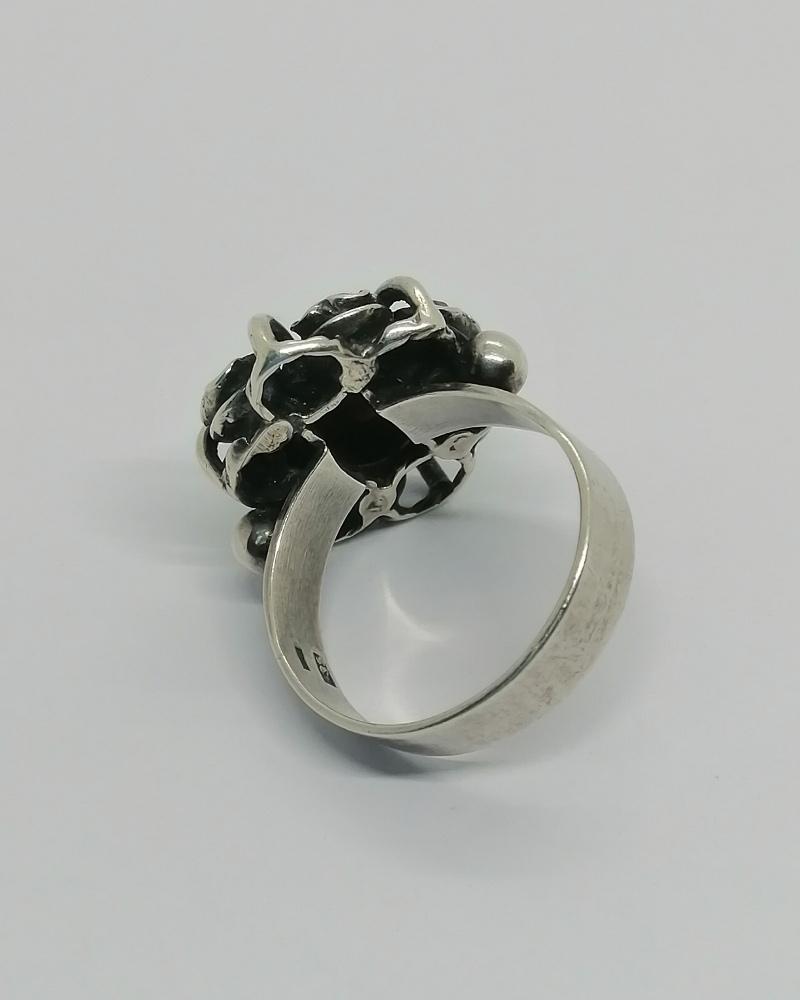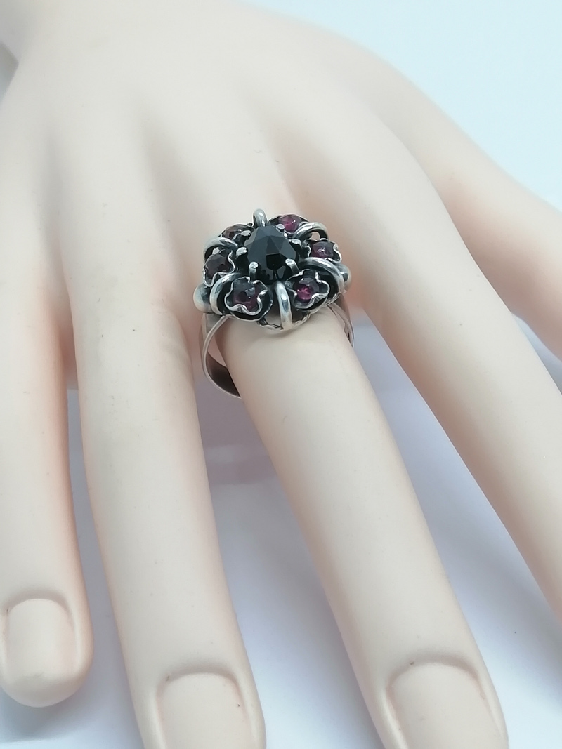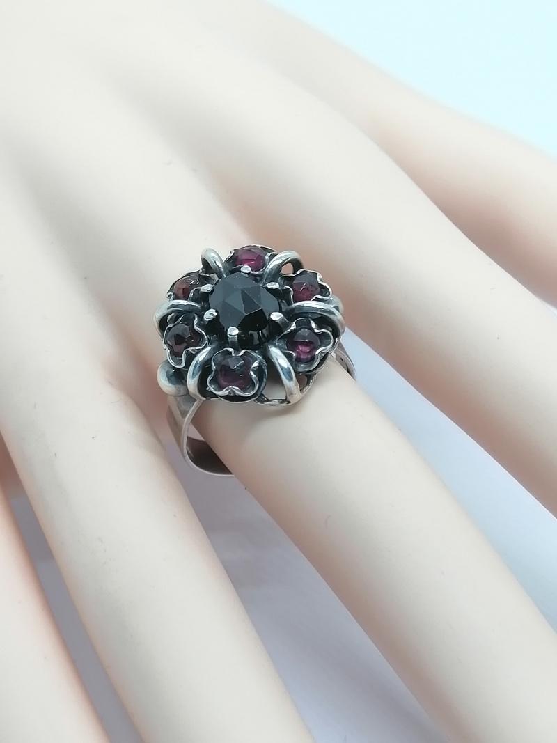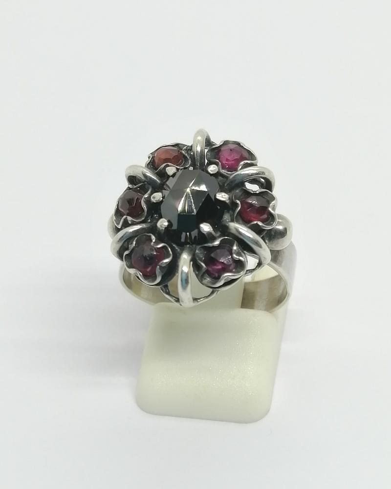 Bague argent, en forme de fleur avec sertie de grenats naturels, 1940-60.