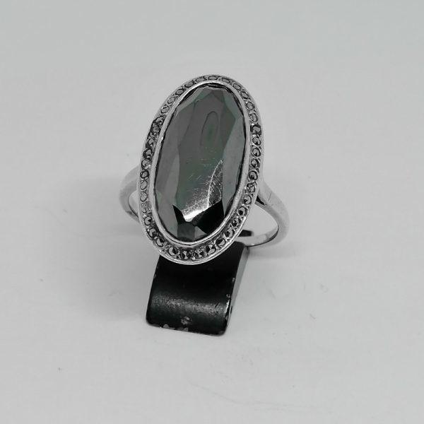 Bague argent avec au centre une hématite facettée de forme ovale en sertie clos et entourage de petites marcasites, travail français d'époque 1930, Art Déco.