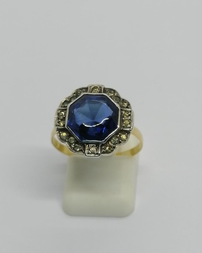 Bague or/argent, avec cabochon facetté de verre bleu, et pierres blanche, Art Déco vers 1925.