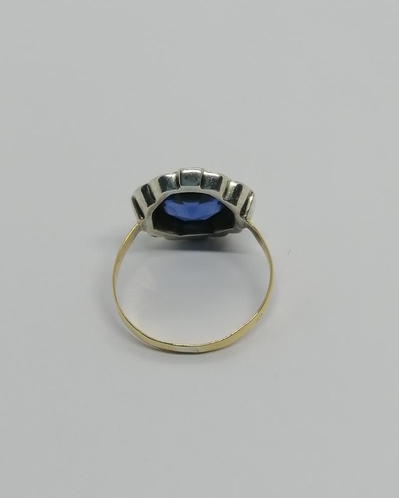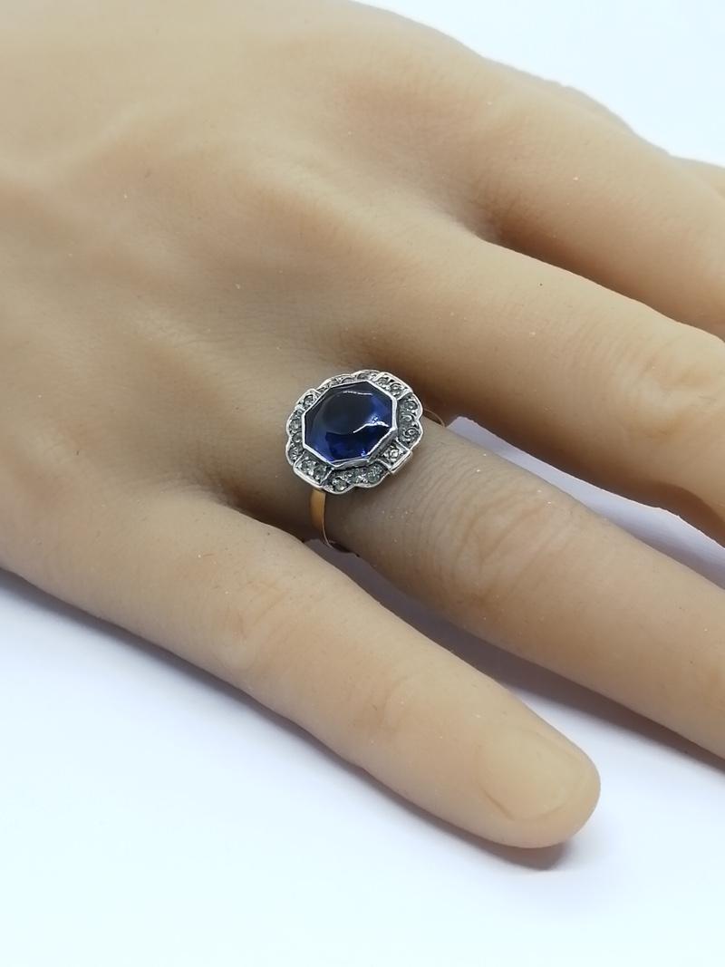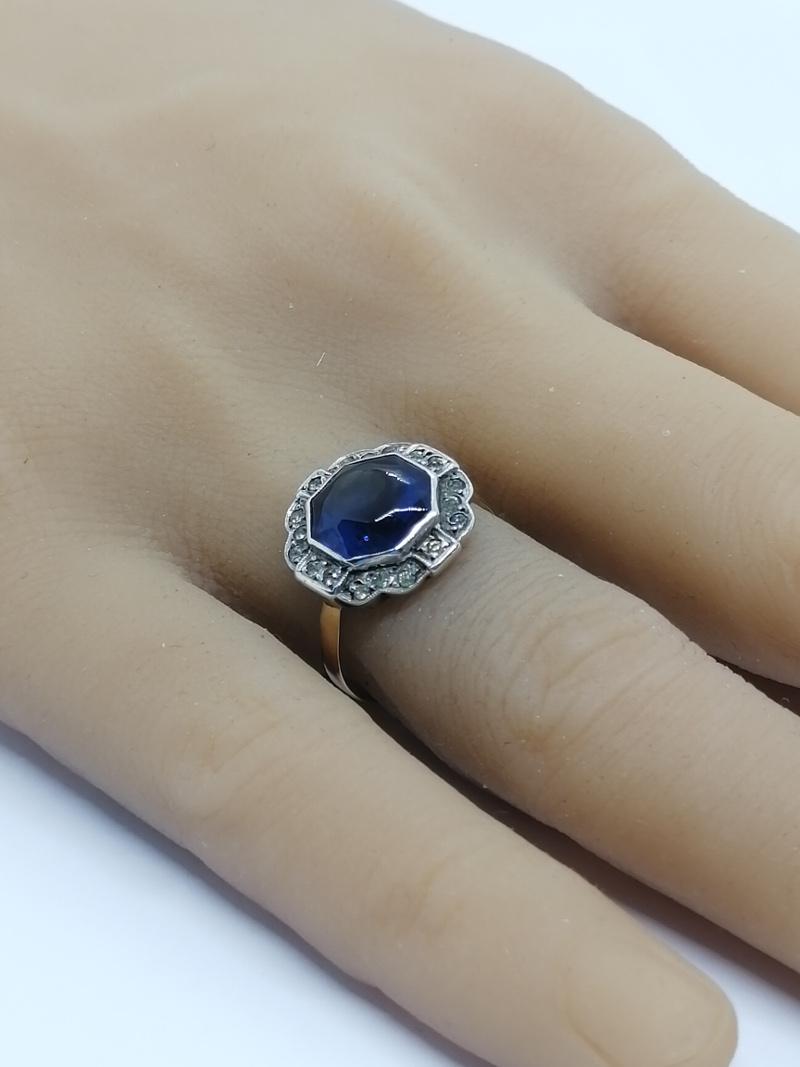 Bague monture en or/argent, anneau en or 750°/°° et chaton en argent 800°/°°, poinçon mixte Français, de forme géométrique façon marguerite, avec autour un pavage en sertie grains de petites pierres blanche, au centre en sertie clos en cabochon sur le dessus et facetté autour, une pierre en verre de couleur bleu saphir, le tout finition frise perlée, travail Français vers 1925, art déco.