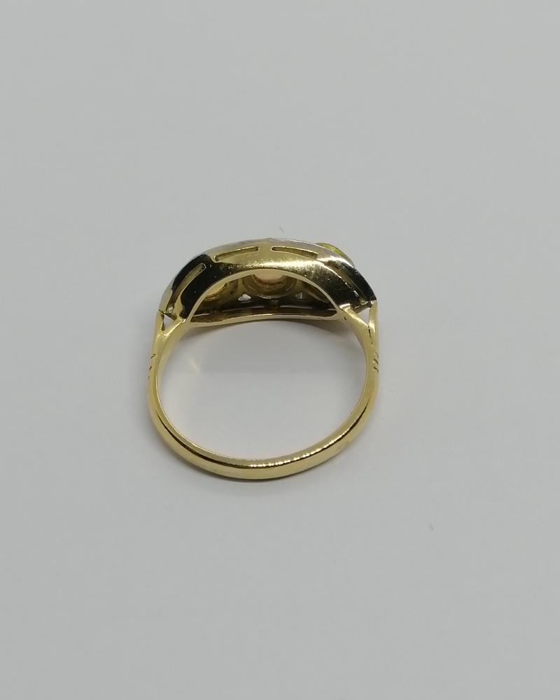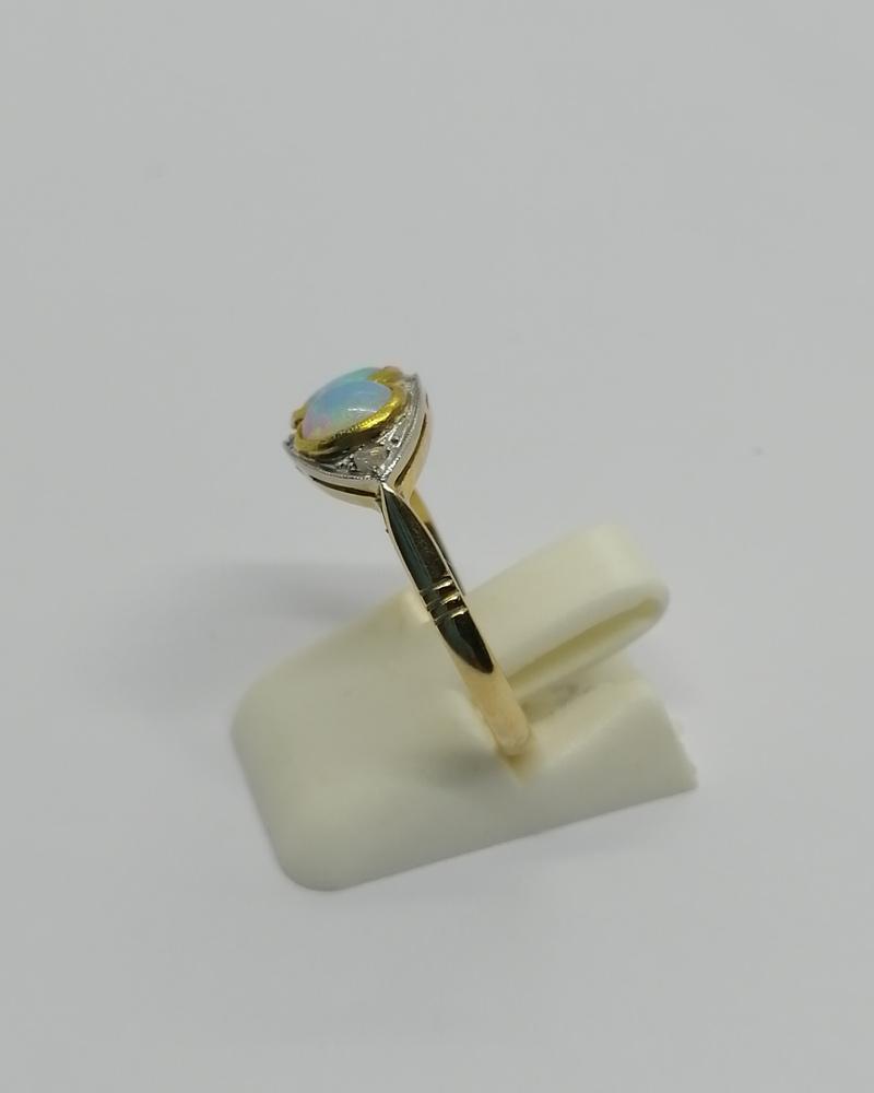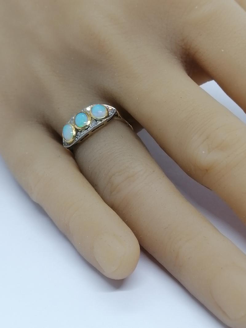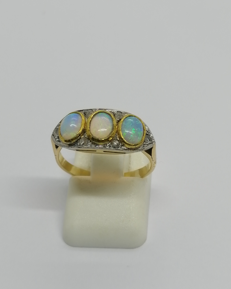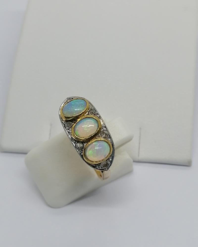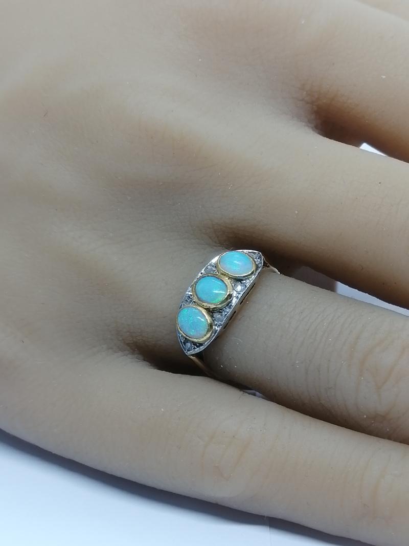 Bague monture en or jaune légèrement rosé, sertie en blanc, de forme ovale et sertie clos perlé, de trois magnifique petits cabochons d'opales naturels avec un superbe irisé en couleurs bleu et vert, tout autour frise perlée, et sertie grains de roses de diamants naturels et facettés, chaton ajouré, et stries décoratif sur anneau de chaque côté, travail Européen, vers 1900, Art Nouveau, beau bijou peu courant de cette époque avec des opales, en rapport à la légende qui lui donner mauvaises presse.