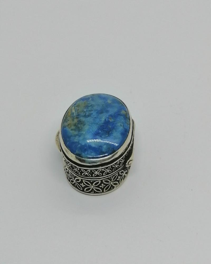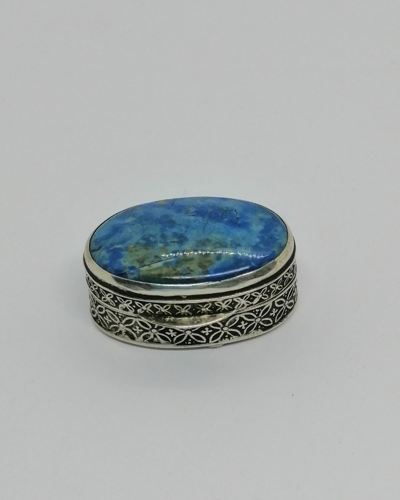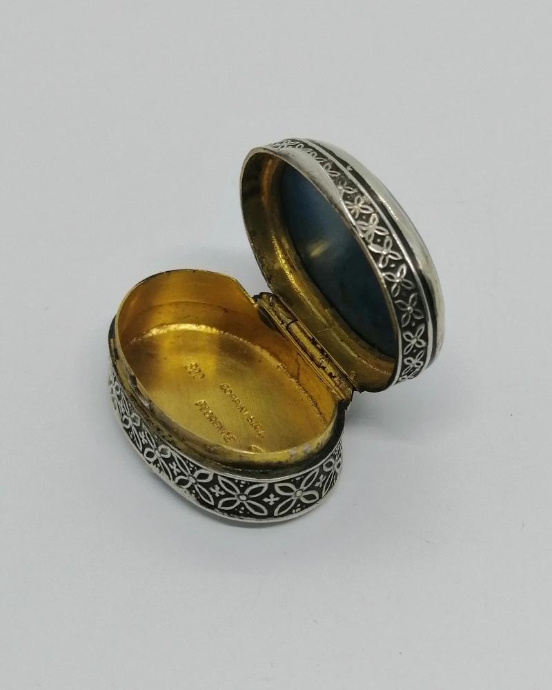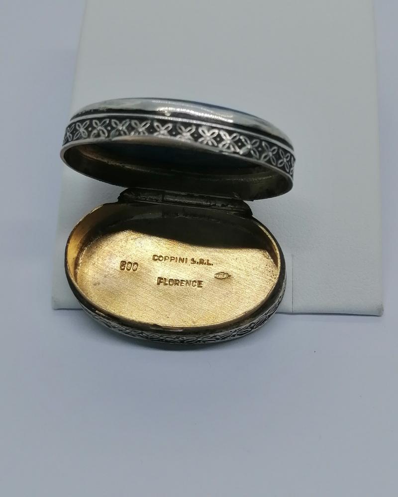 Boîte à pilules , monture en argent massif, petite et de forme ovale, avec décor de deux frises identique l'une plus petite que l'autre, sur le couvercle en sertie clos une pierre bleu marbrée naturelle, un cabochon d'Apatite, intérieur vermeil, couvercle sur charnière se ferme par pression, signé intérieur de Coppini, Florence, une longue dynastie d'orfèvre -bijoutier d'Italie, difficile de dater je pense après 1930-50.