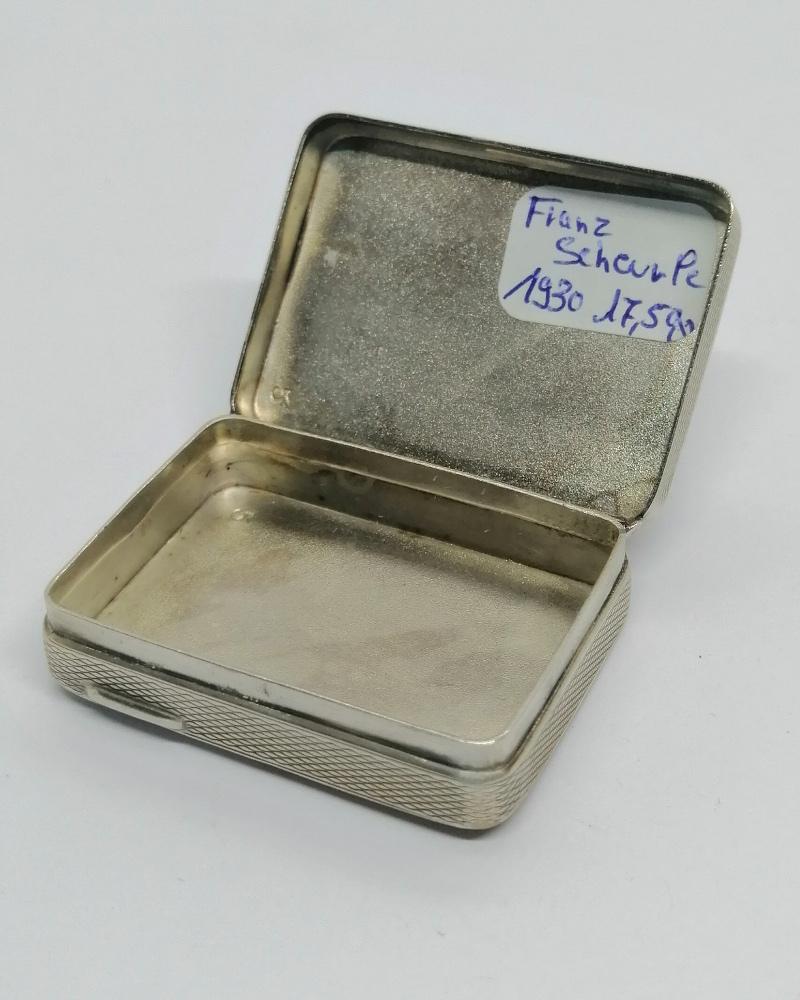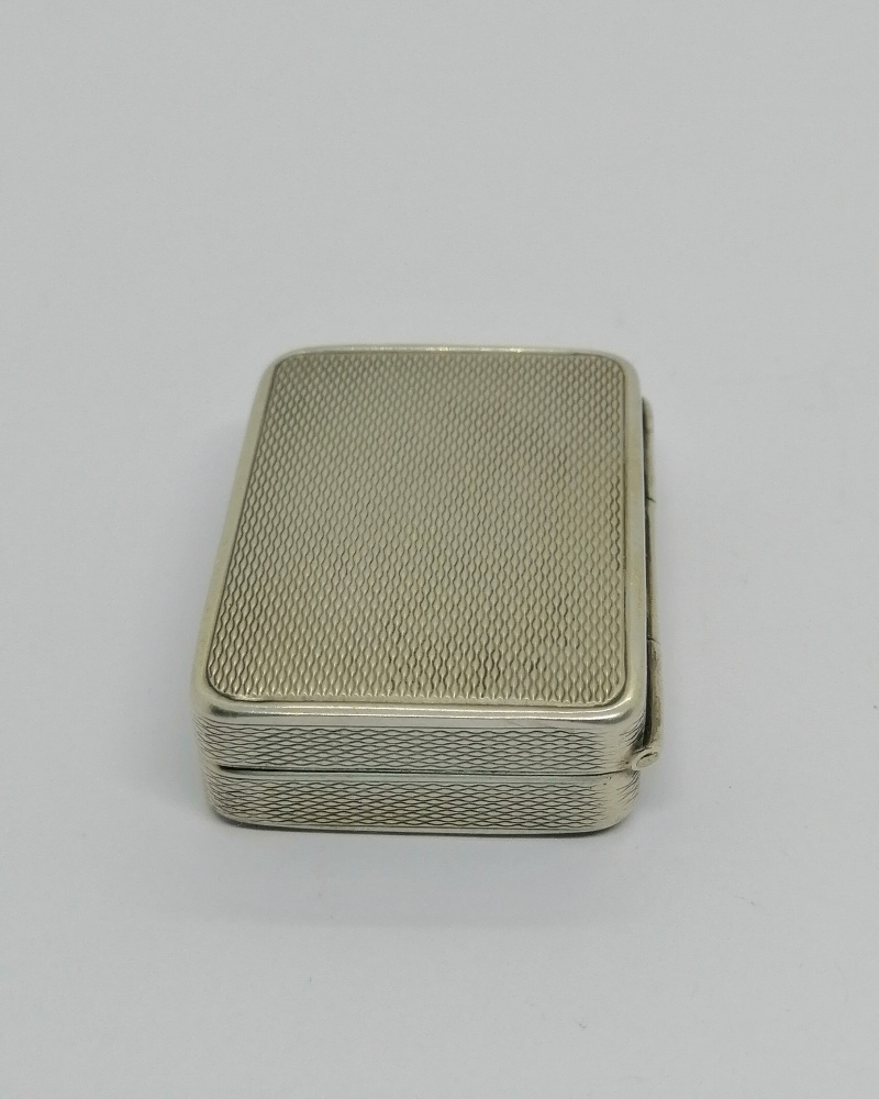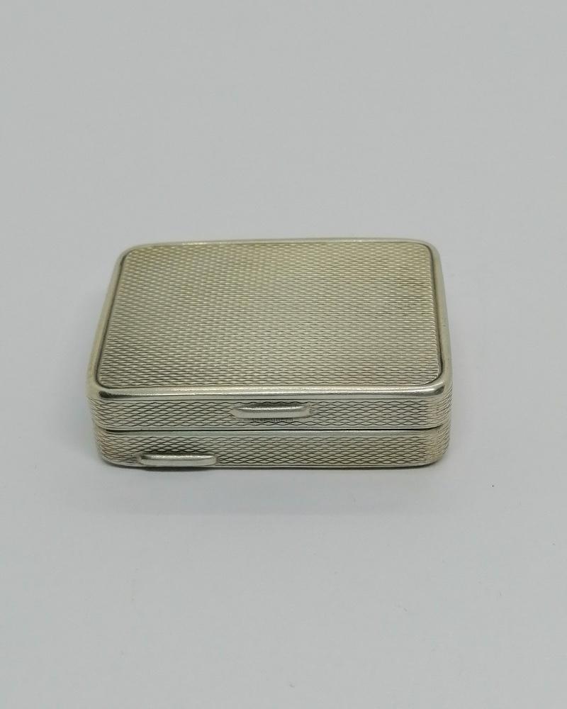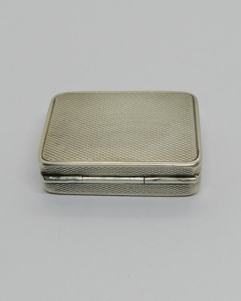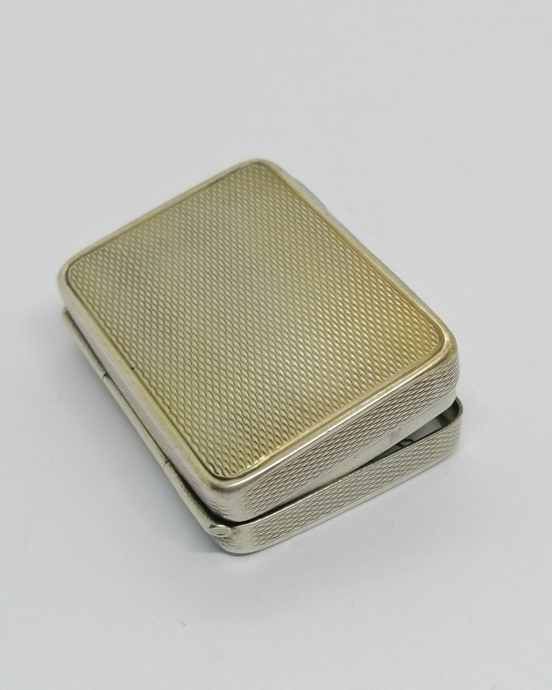 Boîte à pilules, monture argent massif, petite et de forme rectangulaire, totalement travaillée en guillochée sur toutes ses surfaces, couvercle sur charnière, fermeture par pression, travail Allemand de Franz Scheurle, Schwabisch Gmund, vers 1930, Art Déco, document joint.