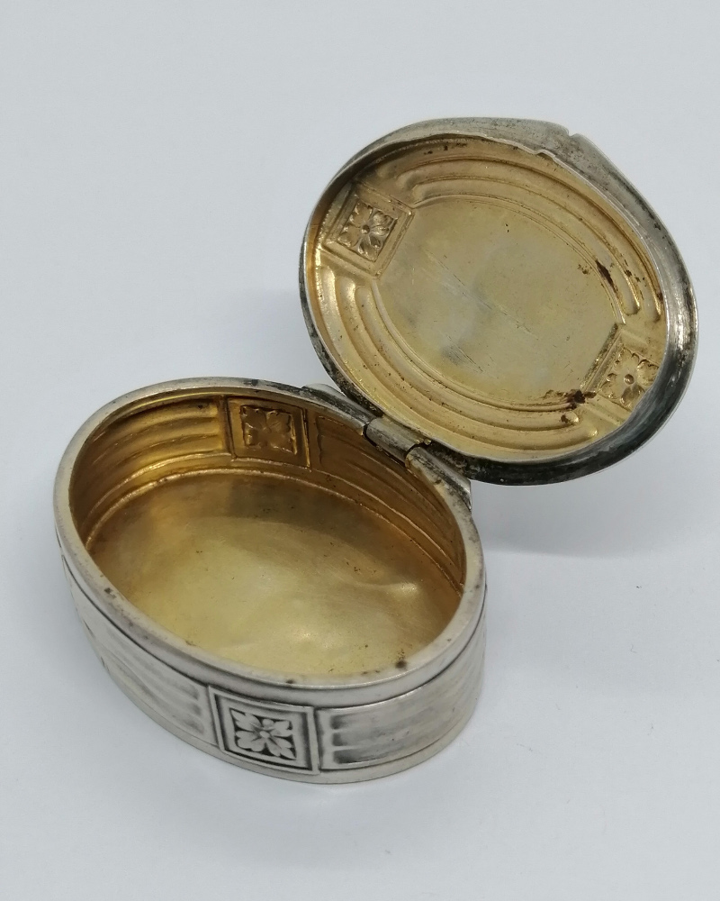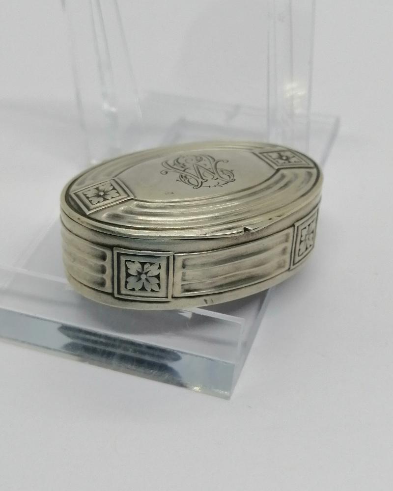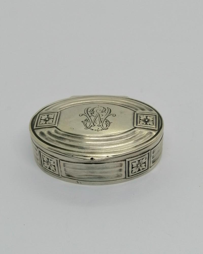 Boîte à pilules , monture argent massif, de forme ovale, avec décor de stries et fleurettes, chiffrée (WE?)sur son couvercle sur charnière et légèrement bombé, fermeture par pression, intérieur en vermeil, travail Européen vers 1920.