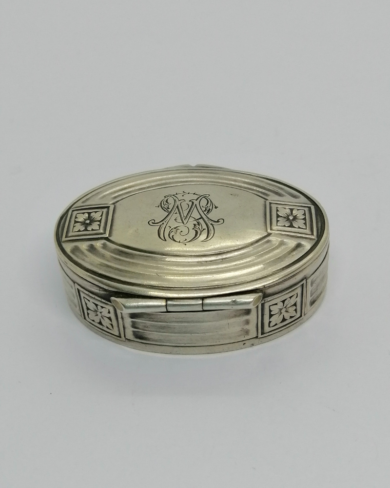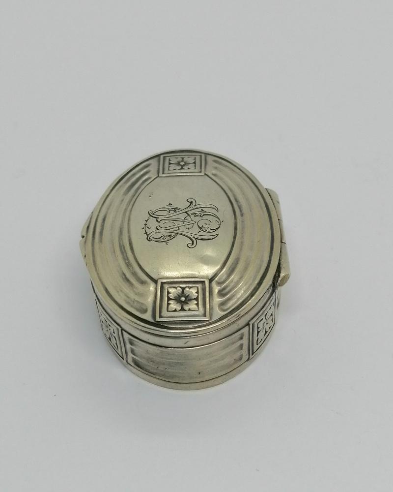 Boîte à pilules argent massif, ovale, ouvragée et chiffrée, vers 1920.
