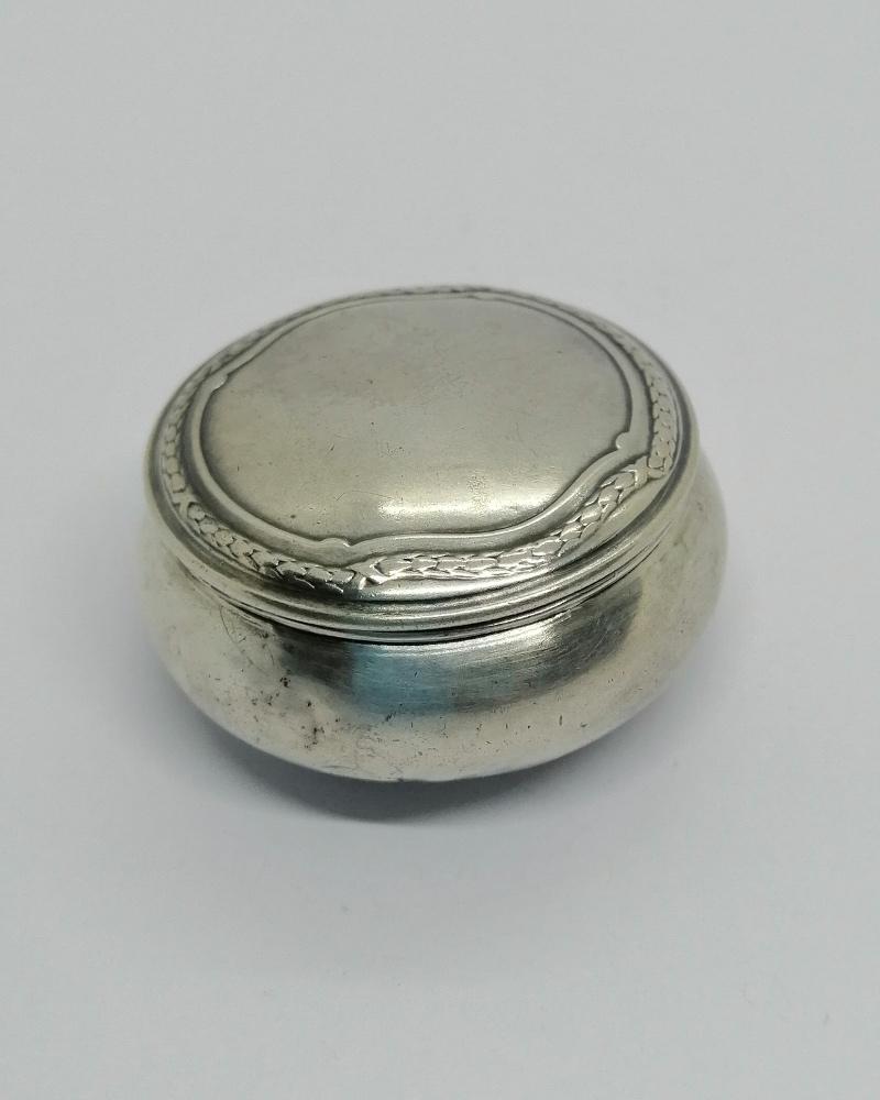 Boîte à pilules, argent massif, ronde avec guirlande végétale, 1900-20.