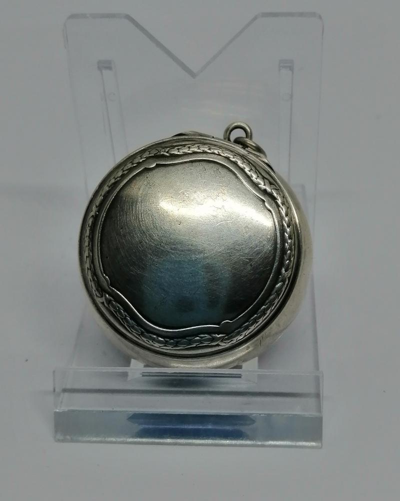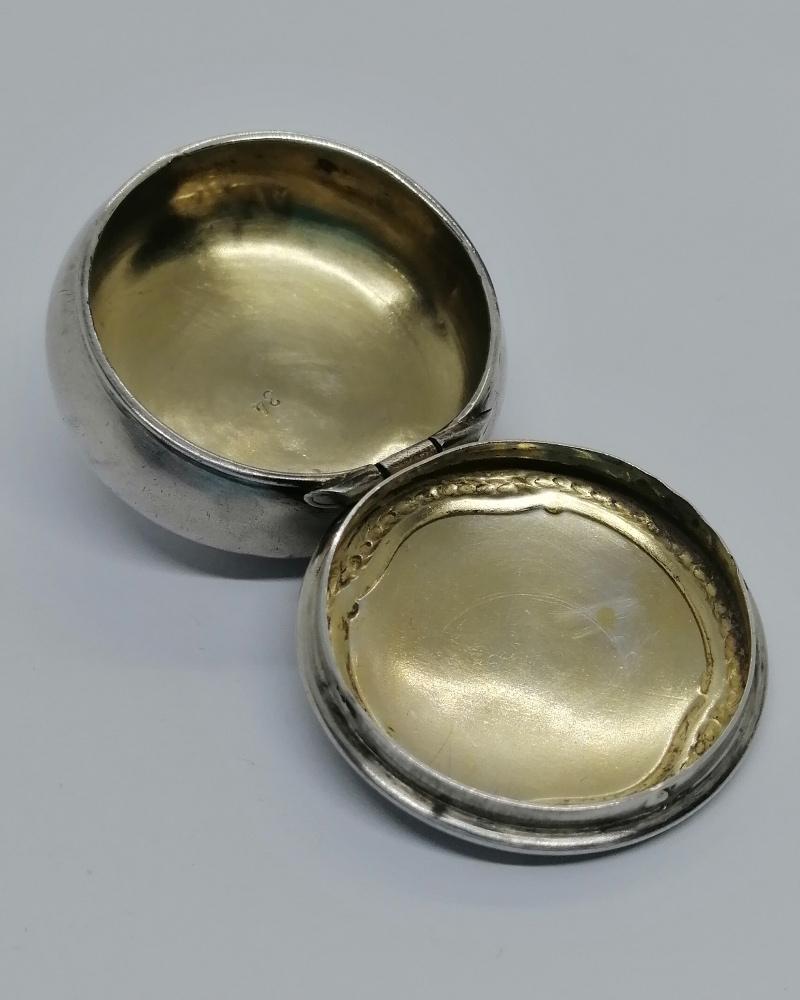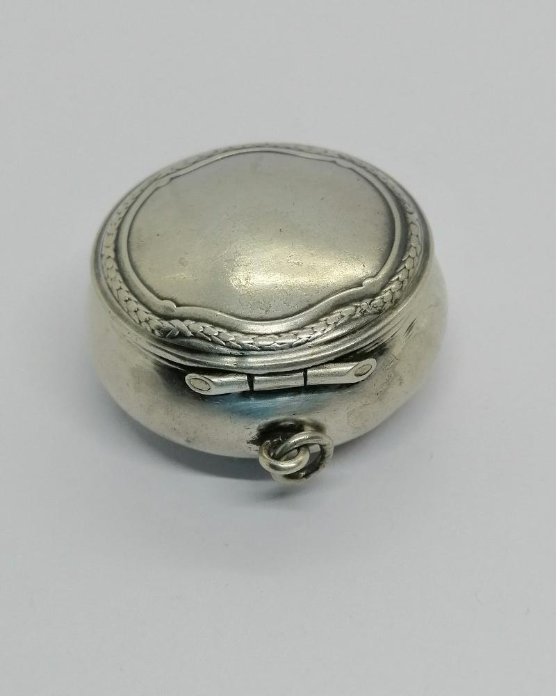 Boîte à pilules , monture argent massif, de forme ronde et bombée, avec sur le couvercle sur charnière, une discrète guirlande végétale, fermeture par pression, avec anneau permettant de l'a mettre sur chaîne, intérieur en vermeil, travail sans doute Allemand vers 1900-20.