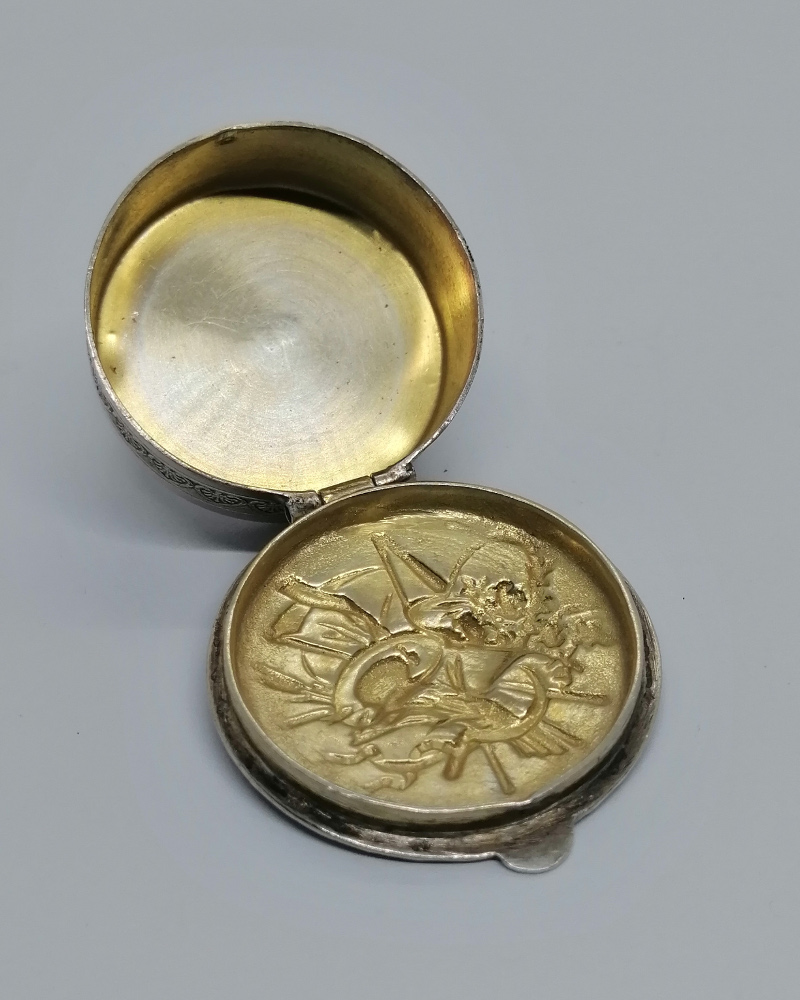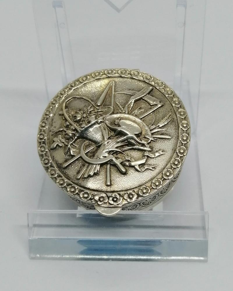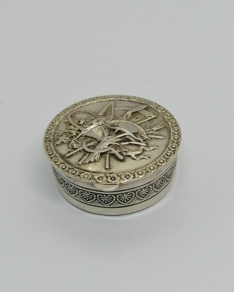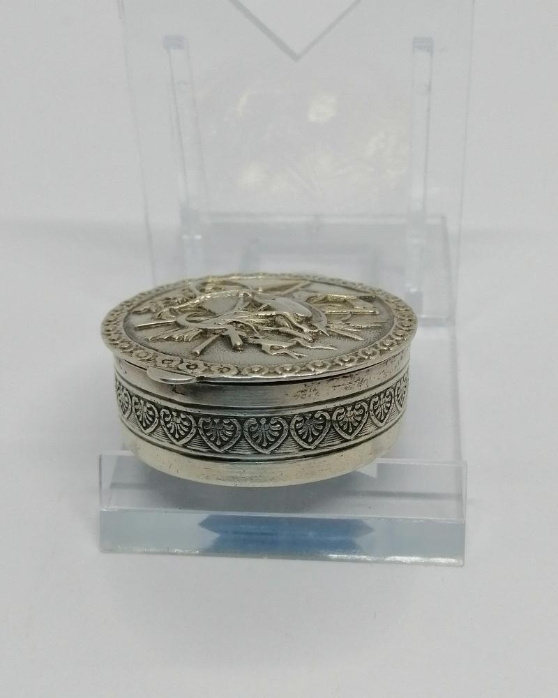 Boîte à pilules , monture argent massif, de forme ronde massive, avec sur son couvercle sur charnière un décor d'allégories de l'été, sur fond façon brossé, fermeture par pression, intérieur en vermeil, entourage d'une frise florale, tout autour une frise de palmettes, travail Allemand vers 1900-20, Art Nouveau.