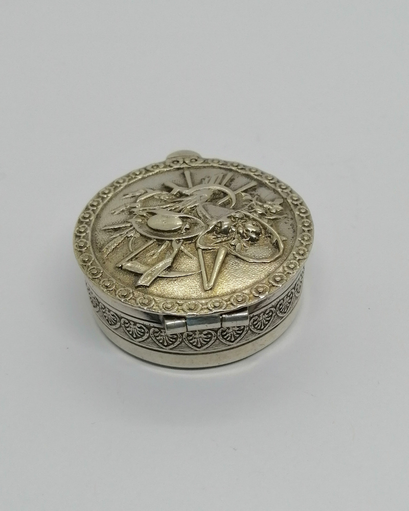 Boîte à pilules argent, ronde, avec allégories de l’été, 1900-20.