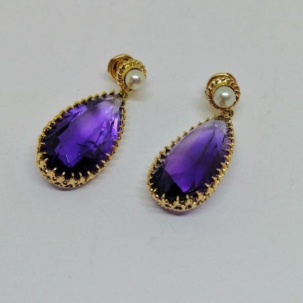 Paire de boucles d'oreilles pendantes en or jaune, avec sublime améthystes en poires et perles de culture, sertie en couronne, fermoir de sécurité avec système Alpa, deux positions en rapport avec l'épaisseur du lobe sont possible, travail Français d'époque fin 1930-40.