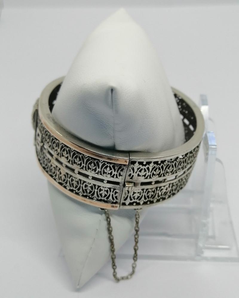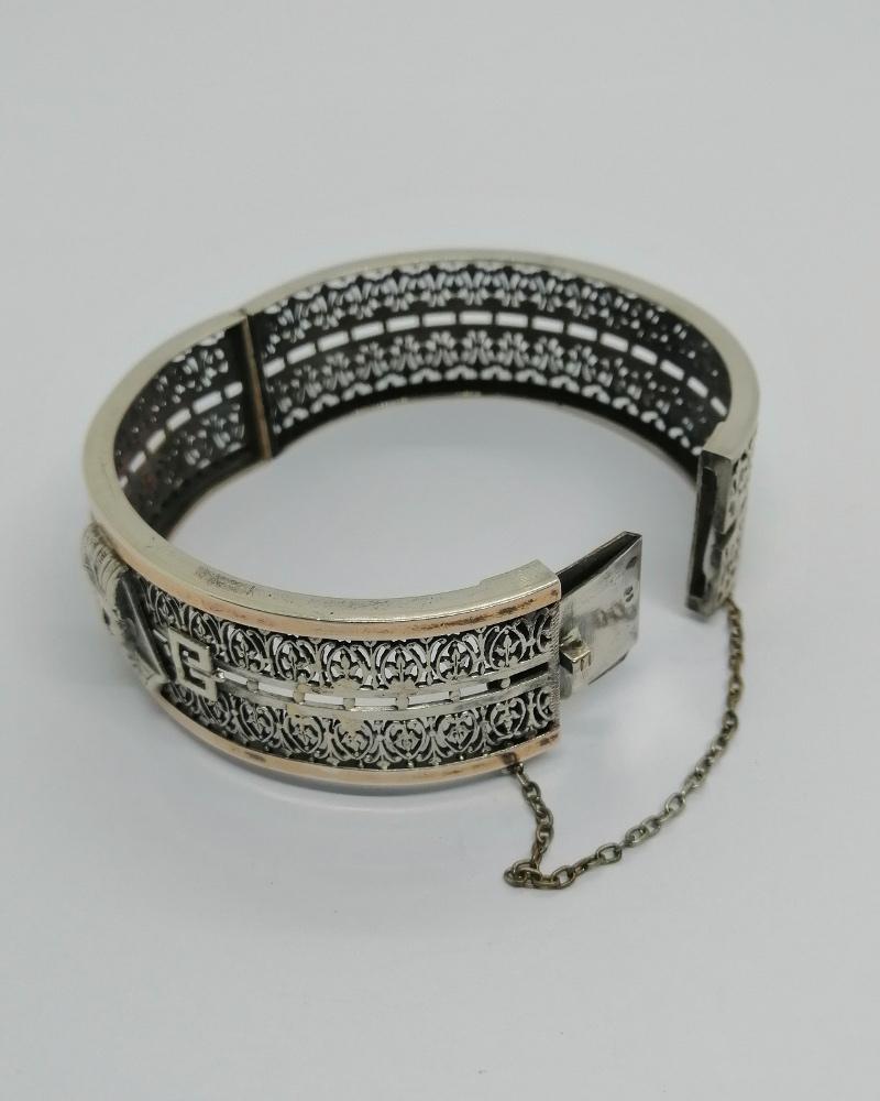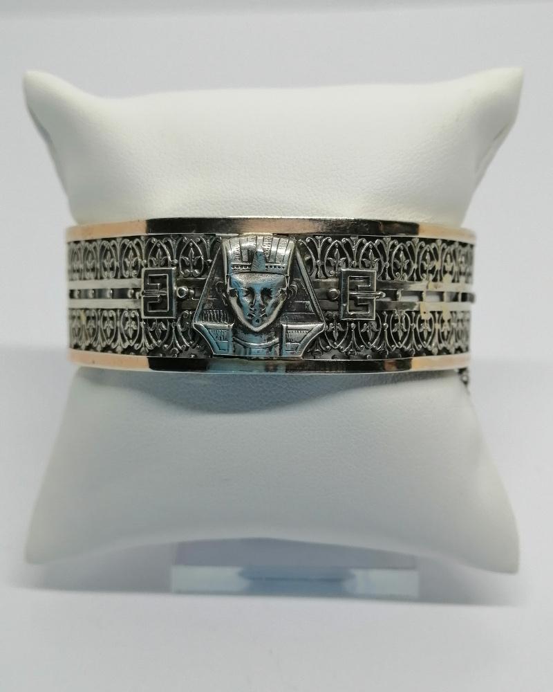 Bracelet monture en argent massif, jonc ajouré d'une grille ouvragée sur l'ensemble, devant au centre une tête de Pharaon, également en partie avant des rebords de couleur rosé, très beau modèle "Egyptomanie", période de découverte archéologique, système fermoir à cliquet et chaînette de sécurité, travail Français par l'Orfèvre Charles Godin, au 50 Rue de Turenne à Paris, document joint, vers 1900, Art Nouveau, peu courant sur le marché.