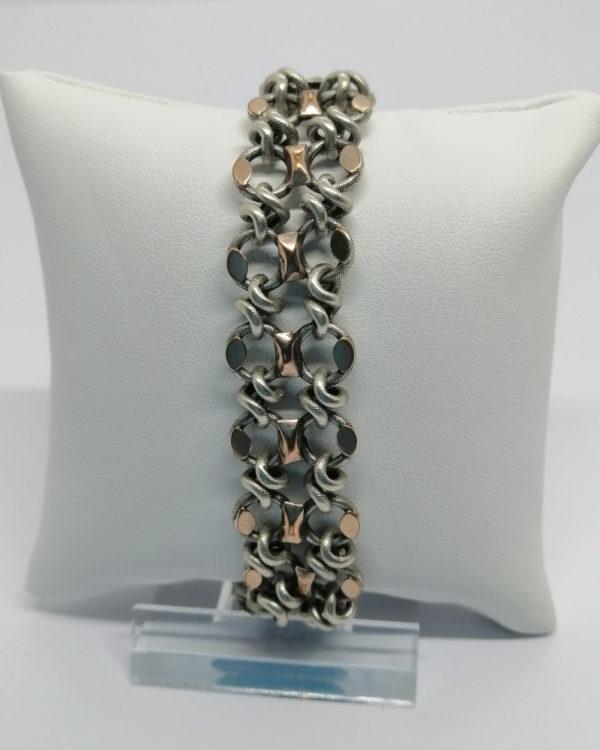 Bracelet monture en argent massif, maille ancienne plate et creuse, avec sur certains endroits des pastilles de couleur rosé, avec une petite breloque ronde travaillé d'un motif, système fermoir anneau ressort, travail Français, Parisien, vers 1900-20.