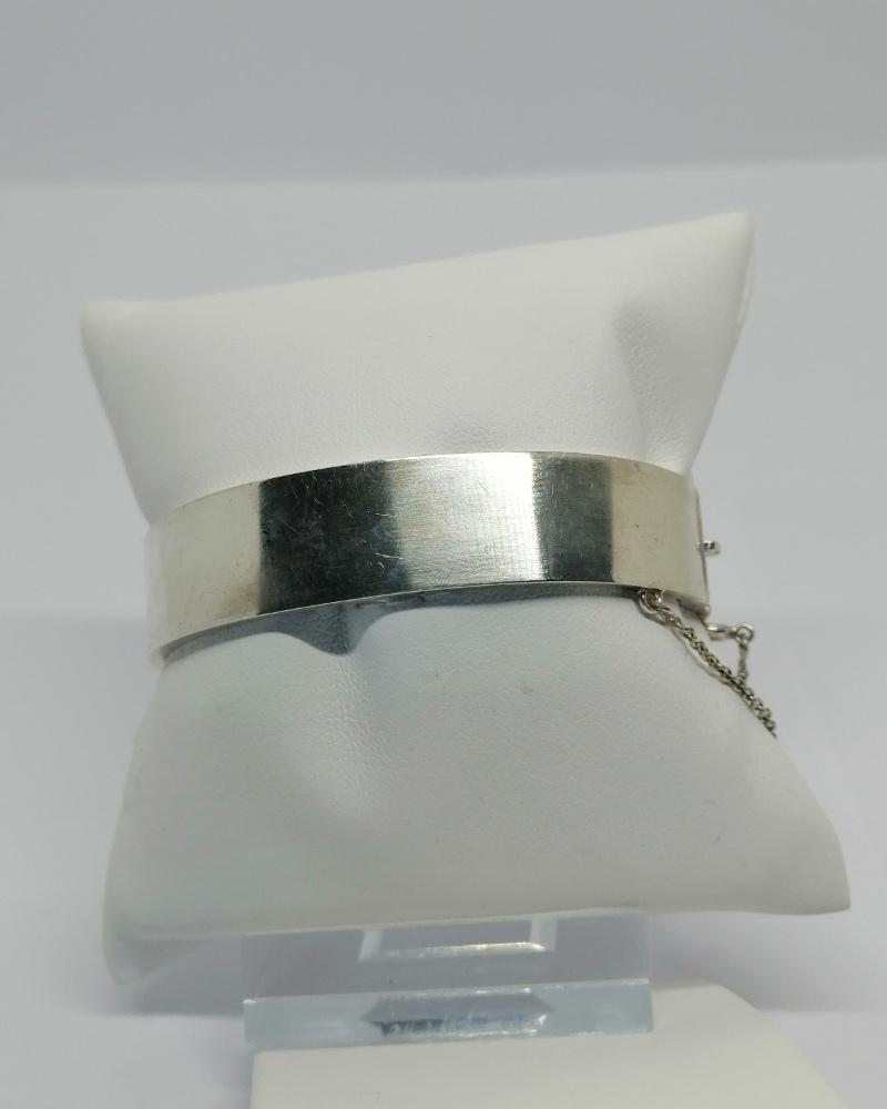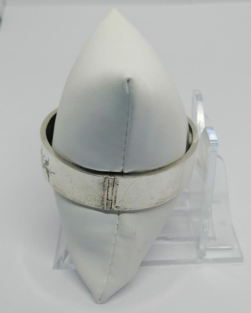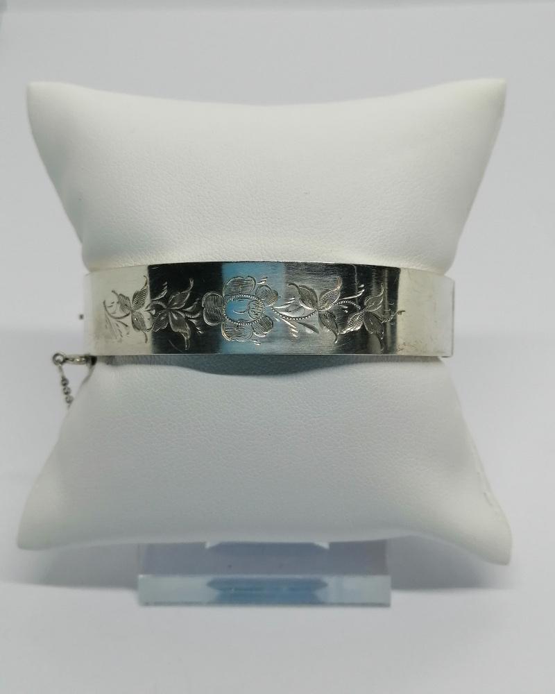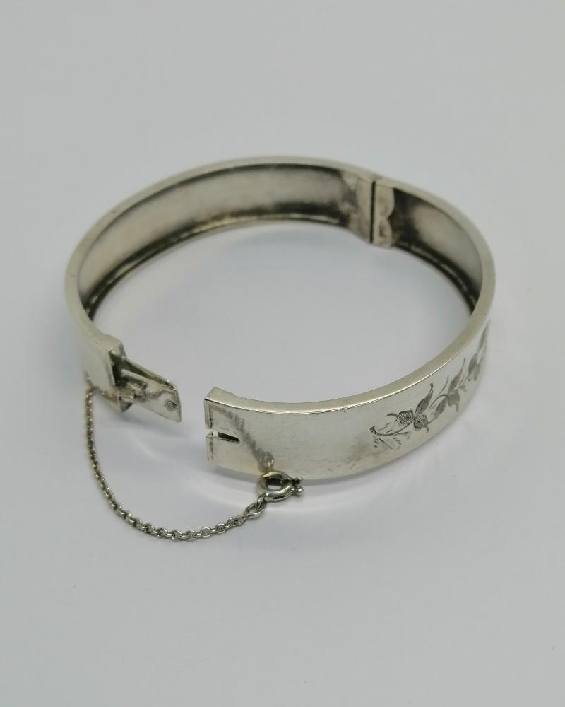 Bracelet monture en argent massif, petit jonc plat, avec sur l'avant un motif végétal et une fleur, à rebord et creux intérieur, système fermoir à cliquet et chaînette de sécurité avec anneau ressort pour l'ouvrir, travail sans doute Allemande vers 1900-20, Art Nouveau.