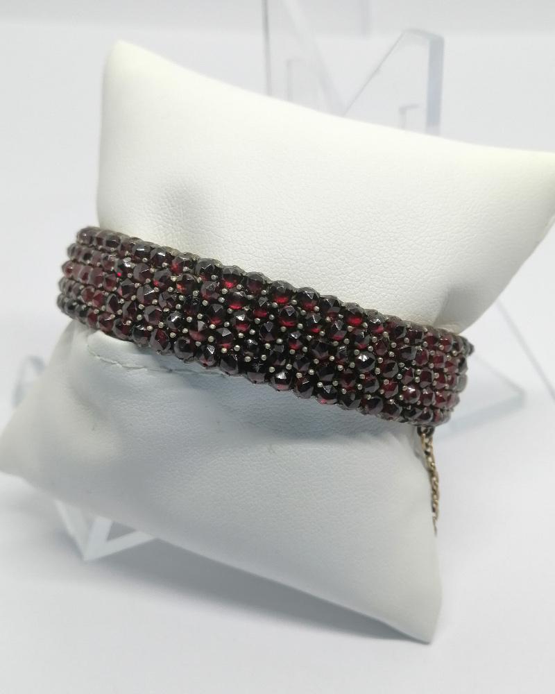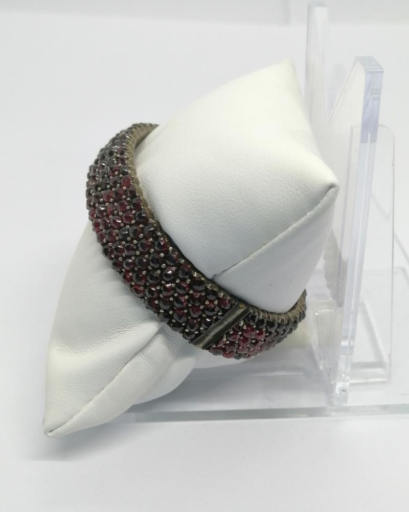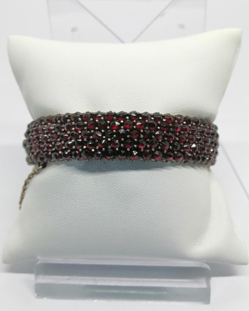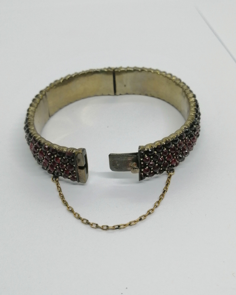Bracelet monture en métal blanc, jonc légèrement bombé et entièrement pavé en sertie grains, de grenats naturels de couleur rouge bordeaux, et de taille bohême, avec système fermoir à cliquet sécurisé et chaînette en métal jaune de sécurité, travail Européen vers 1900, Art Nouveau.