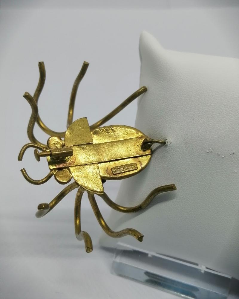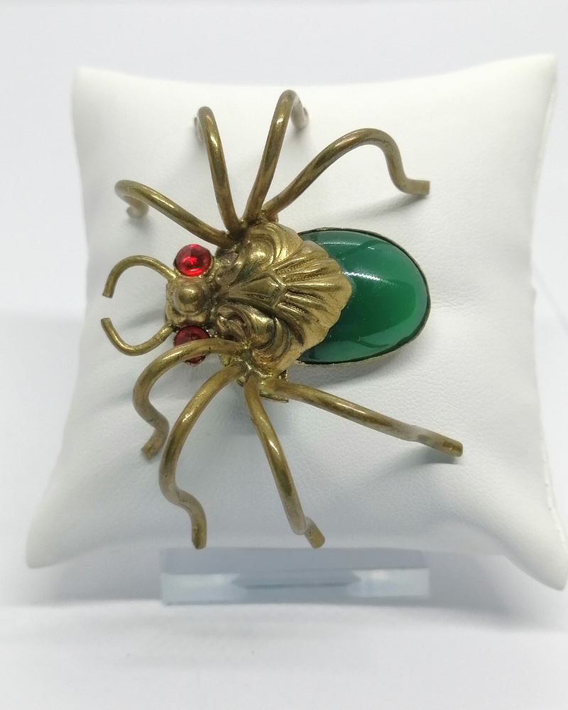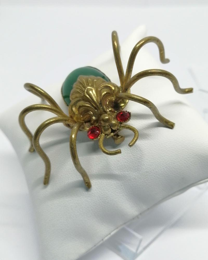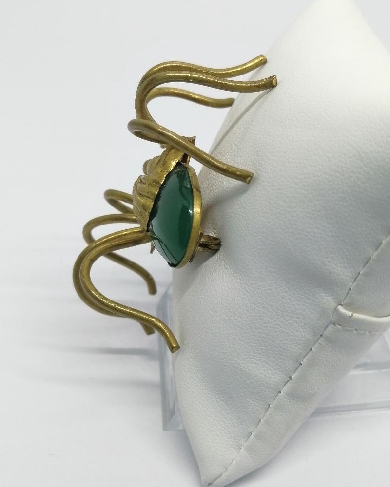 Broche monture en laiton jaune, importante de par sa taille, cette araignée avec un sublime travail de laiton repoussé pour corps, l'abdomen en pierre verte en verre de couleur agate, les yeux en strass rouge, système fermoir à pompe sécurisé, travail de Tchécoslovaquie, vers 1900-20.