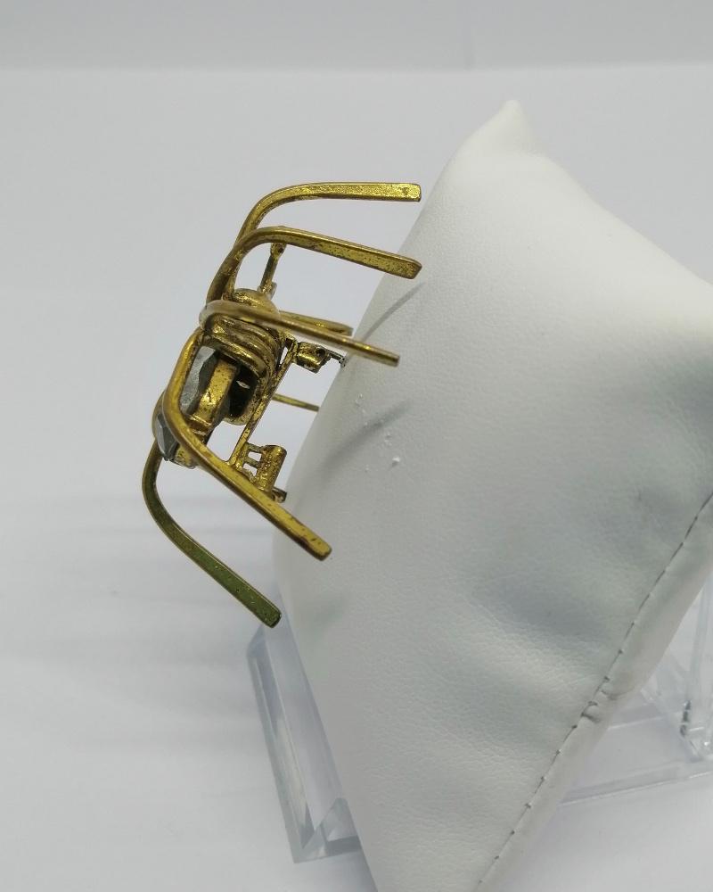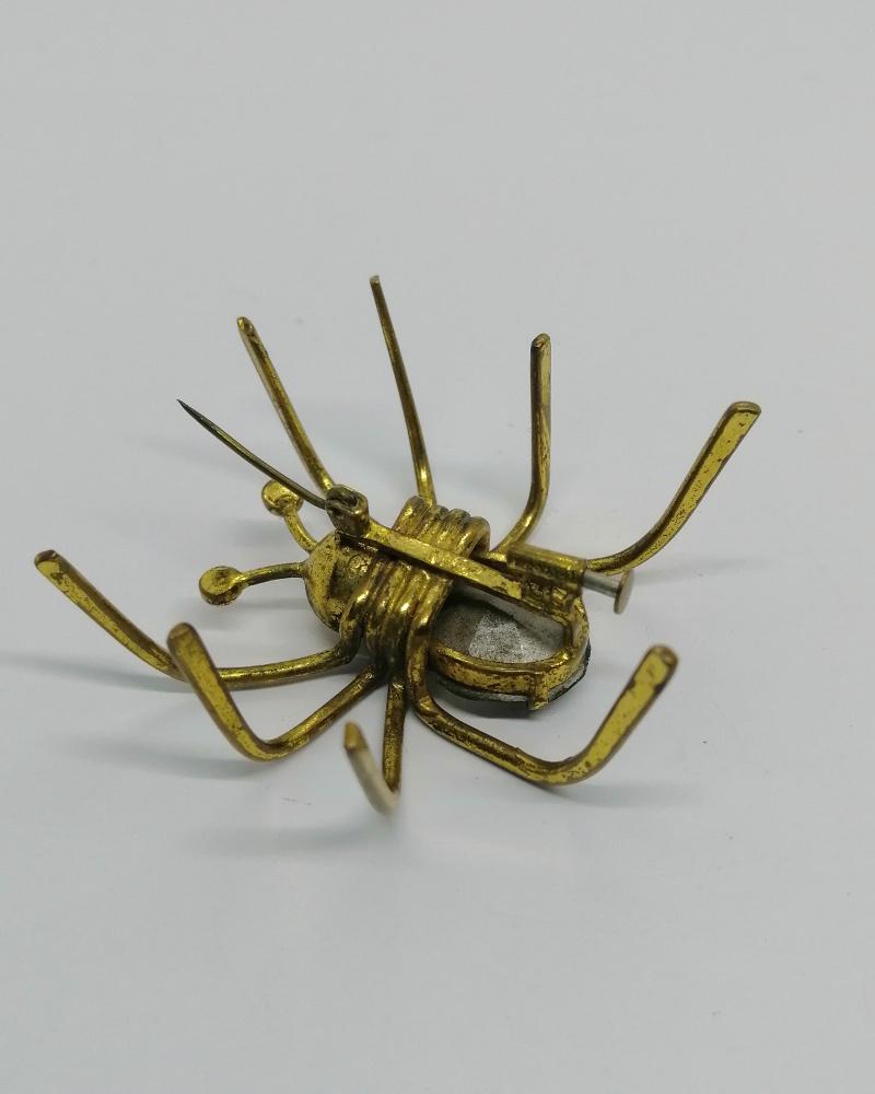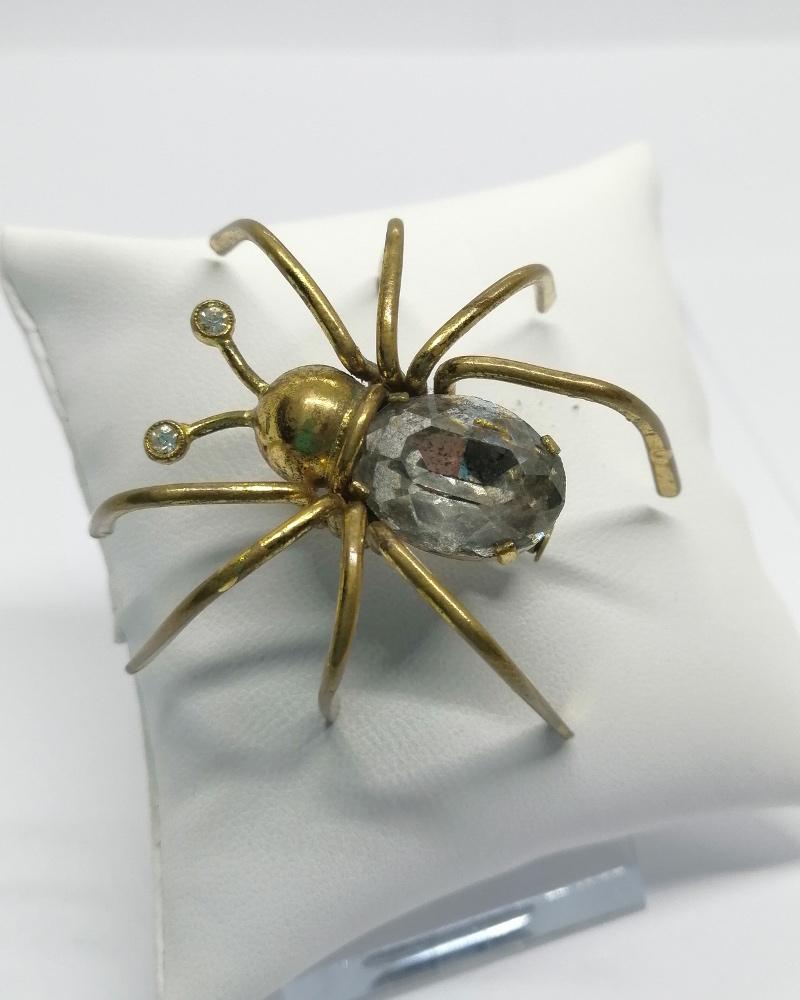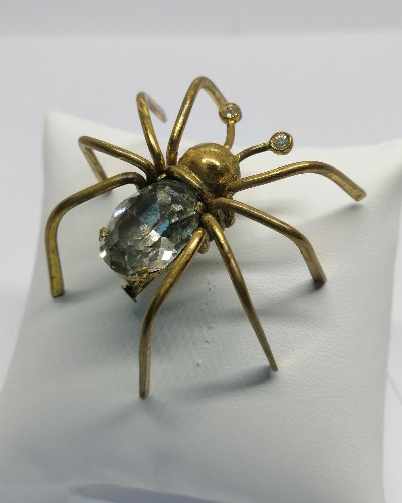 Broche monture en laiton jaune, grosse araignée, avec pour corps un gros strass blanc, et dans les yeux des plus petits, système fermoir à pompe sécurisé, travail Européen, vers 1900-20.