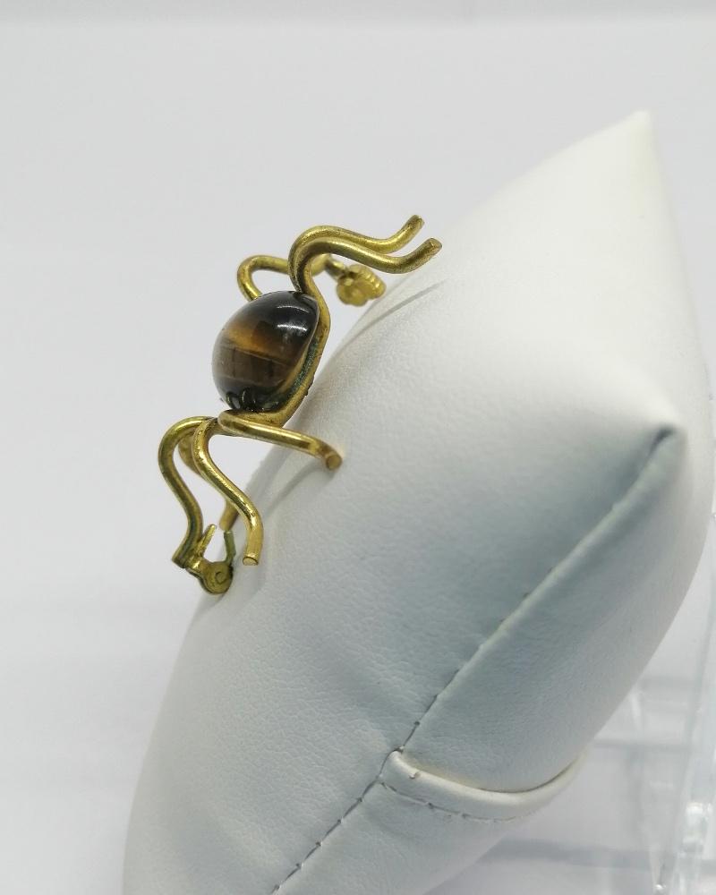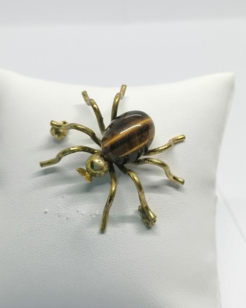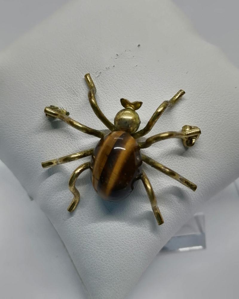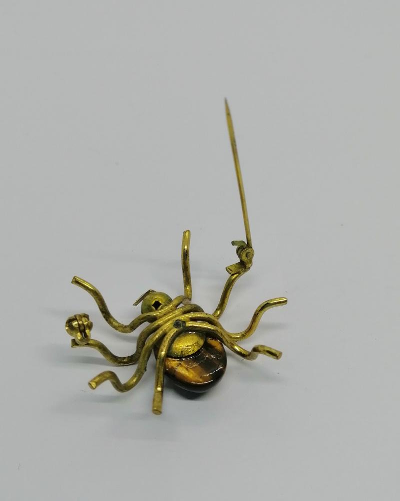 Broche monture en laiton jaune, petite araignée avec pour abdomen une pierre naturelle oeil de tigre, système fermoir goupillon de sécurité, travail Européen vers 1920-30.
