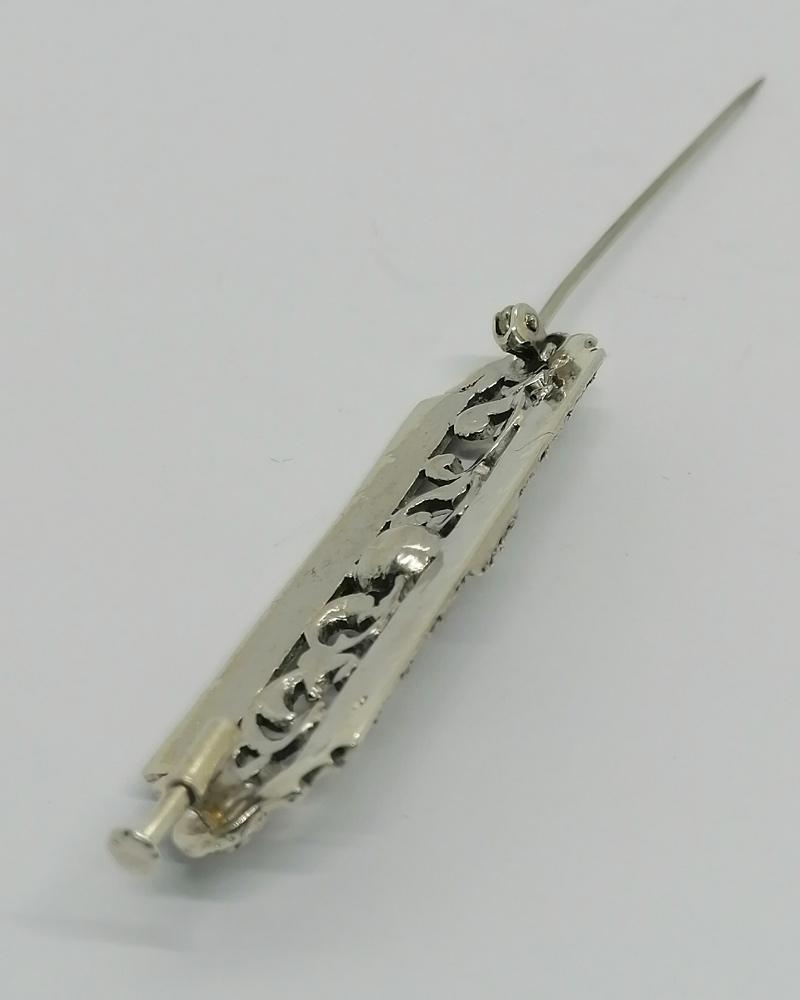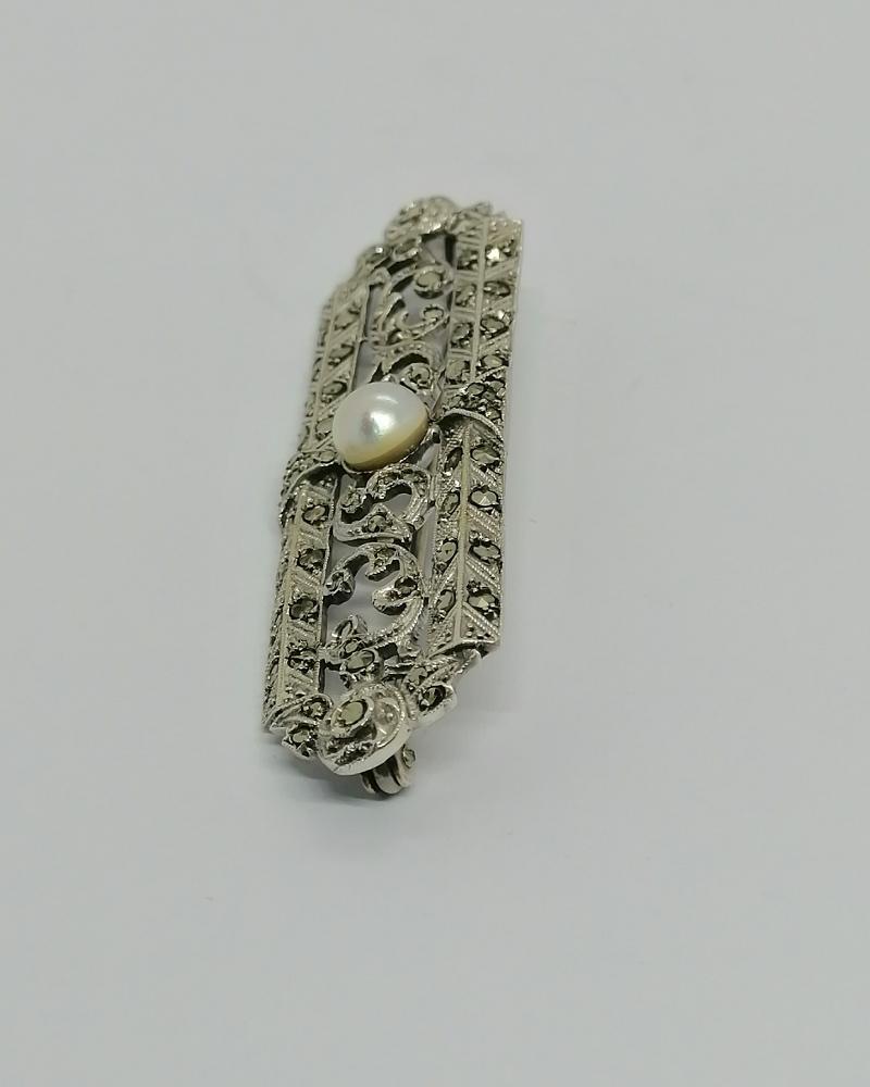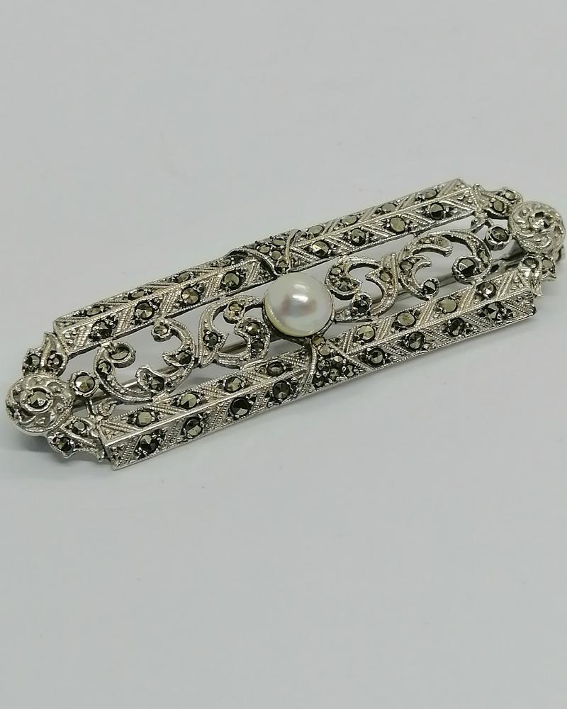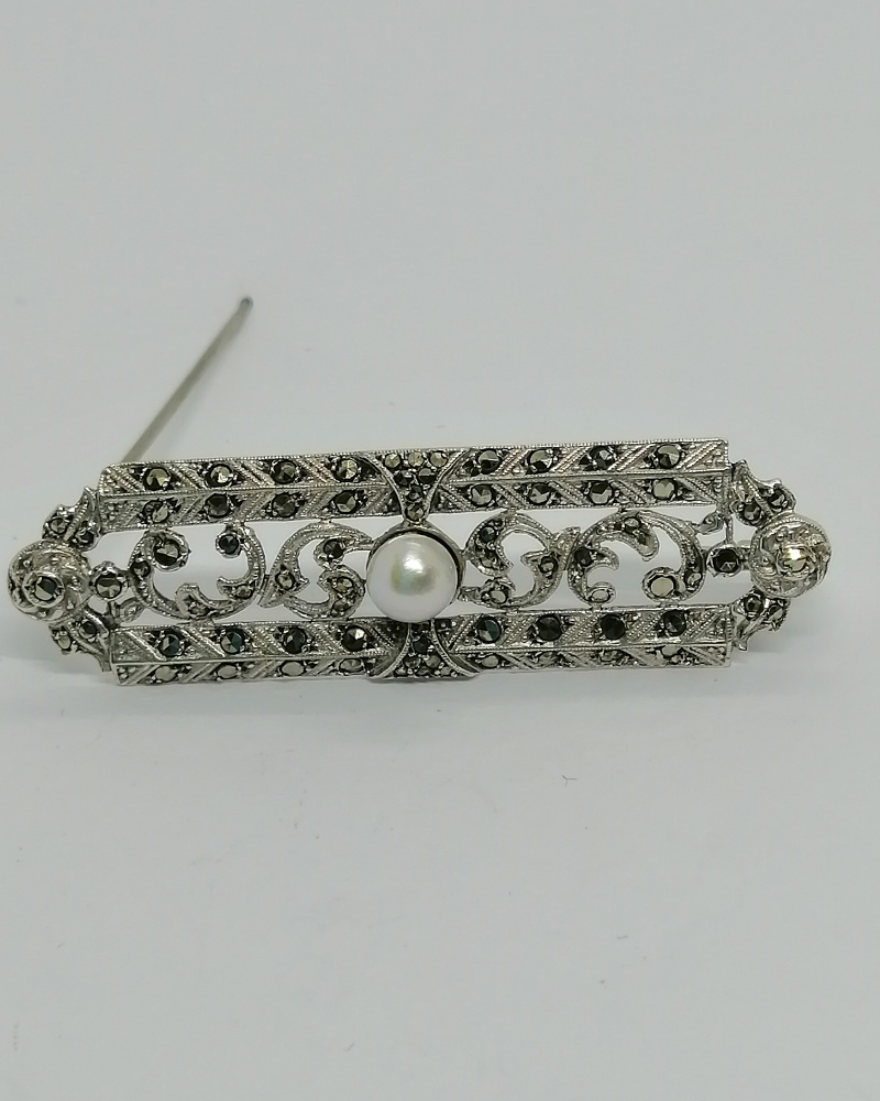 Broche , monture en argent massif, de forme longue et ajourée, avec parties droites et d'autres en arabesques, le tout avec pavage en sertie grains, de marcasites naturelles facettées, au centre une perle bouton naturelle, système fermoir pompe sécurisée, travail Français vers 1925, Art Déco.