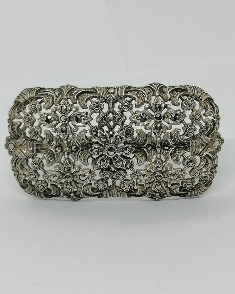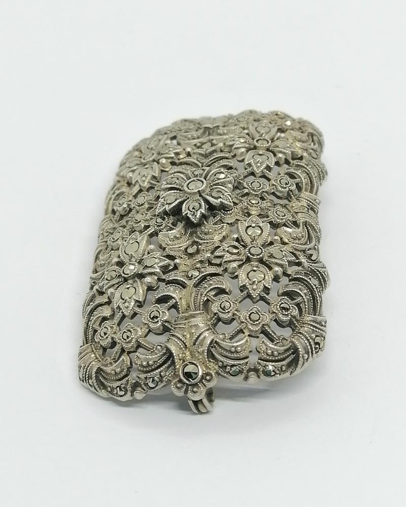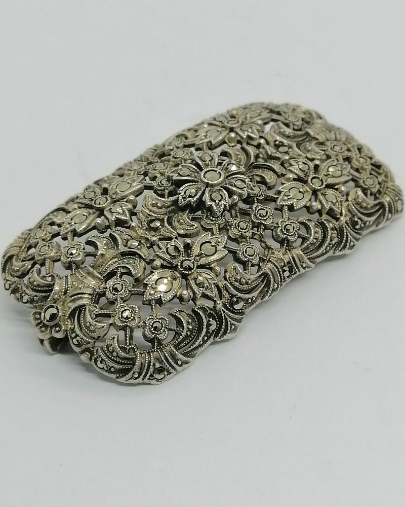 Broche monture en argent massif, importante de taille, de forme rectangulaire et angle arrondies, bombée et ajourée avec pavage en sertie grains de marcasites naturelles et facettées, représentant des motifs de fleurs et feuilles, sur différentes hauteurs, le tout avec des finitions de frises perlées, système fermoir goupillon avec sécurité, travail Européen vers 1930-40.