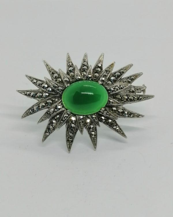 Broche argent, en forme de fleur, pavage marcasites et agate verte, 1920-30.