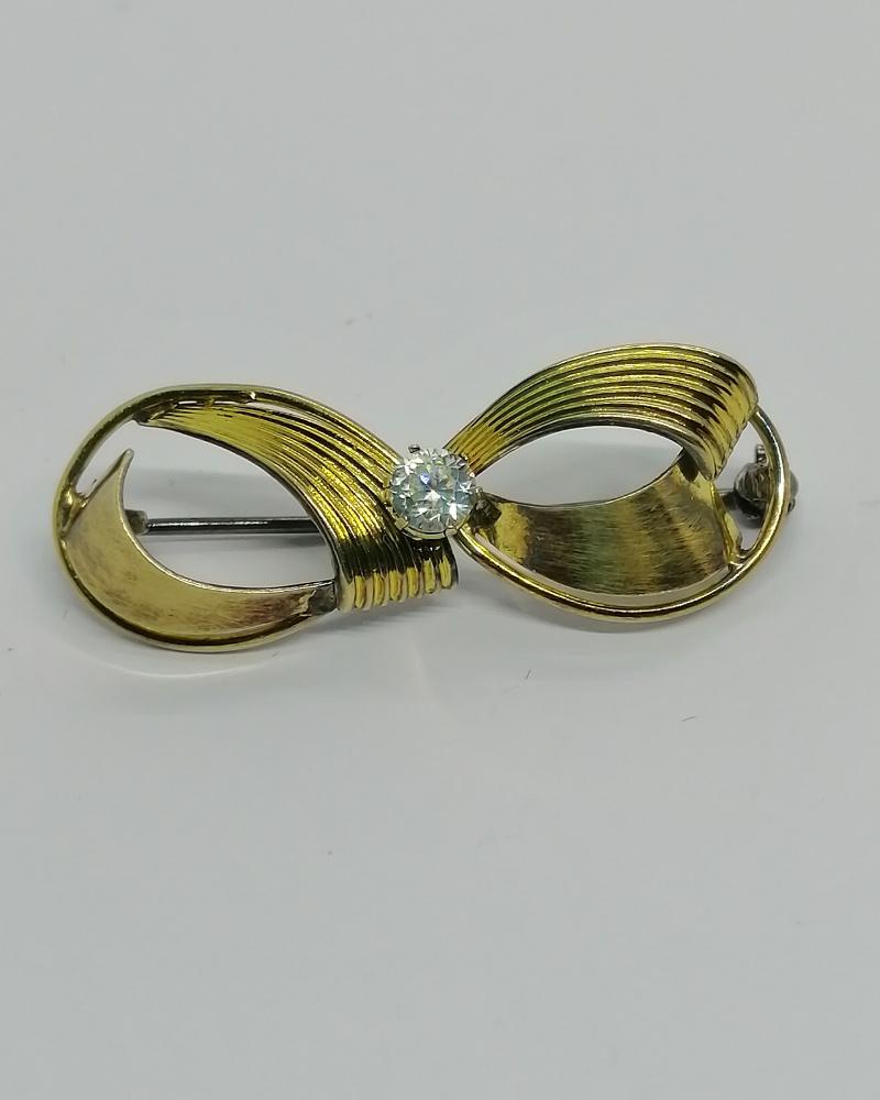 Broche monture en argent massif, entièrement en vermeil, ce petit noeud tout en volume, avec en partie des stries et sur l'autre partie travail en brossé, au centre en sertie griffes un saphir blanc rond et taillé en facettes, système fermoir goupillon sécurisé, travail sans doute Allemand vers 1930-40.