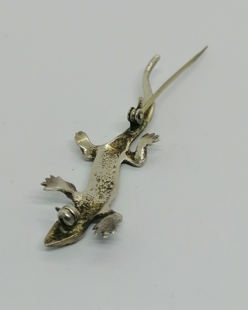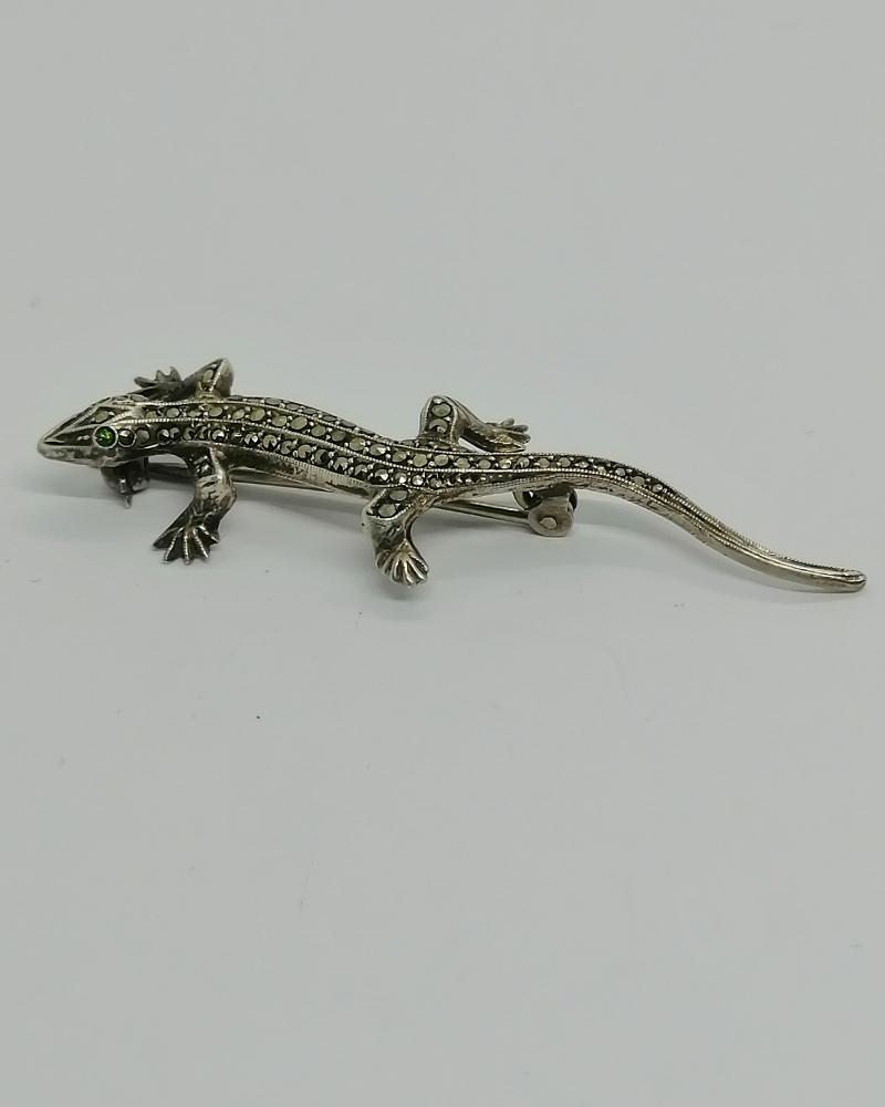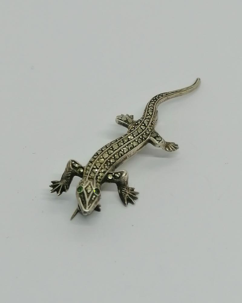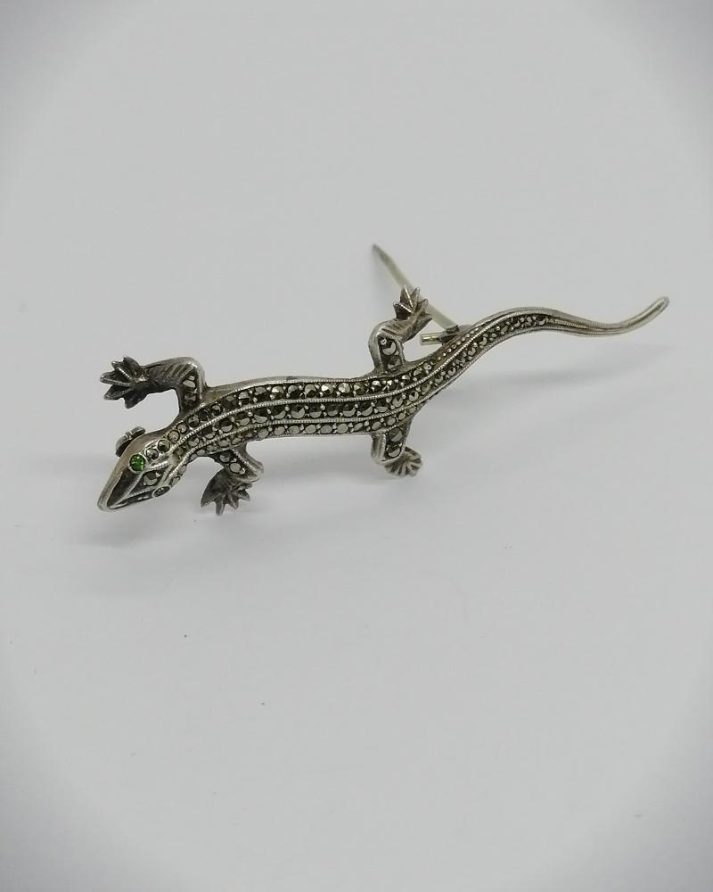 Broche monture en argent massif, représentant une salamandre ou lézard, totalement pavée en sertie grains de marcasites naturelles et facettées, et finition en frise perlée, les yeux sont incrustés de petits strass de couleur vert, système fermoir goupillon sécurisé, travail sans doute Allemand vers 1950-60.