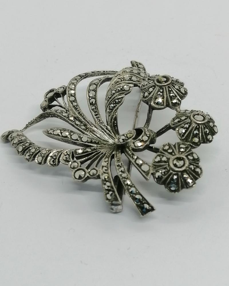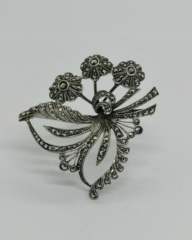 Broche monture en argent massif, de forme végétale stylisée, légèrement galbée, avec pavage de marcasites naturelles et facettées, le tout en finitions de frises perlées, système fermoir à pompe sécurisée, travail sans doute Allemand, vers 1920.
