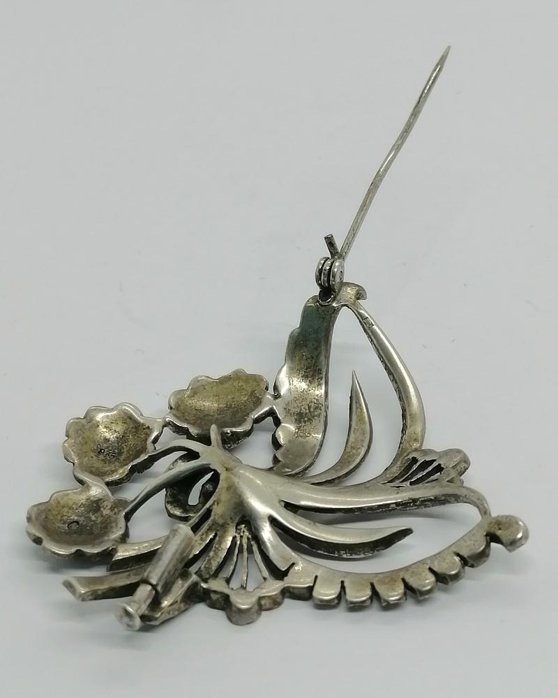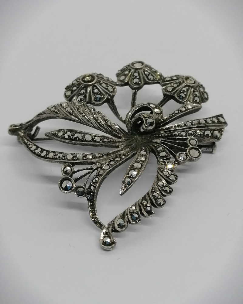 Broche argent, végétal stylisé, pavage de marcasites, vers 1920.