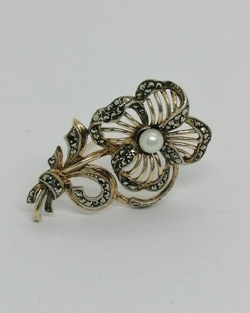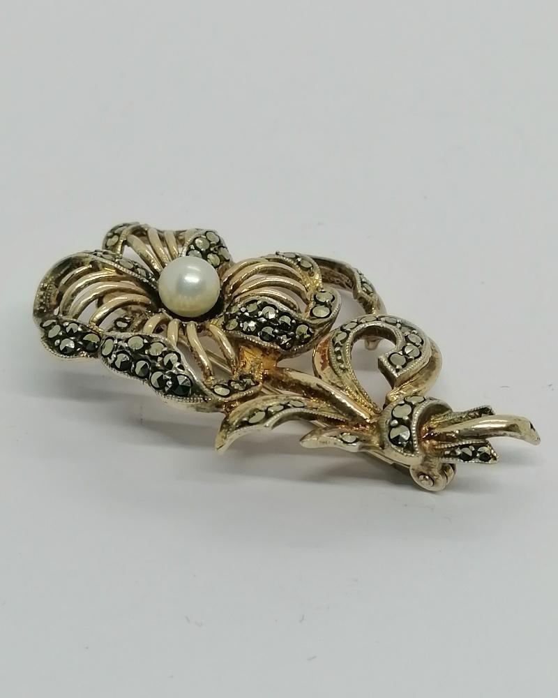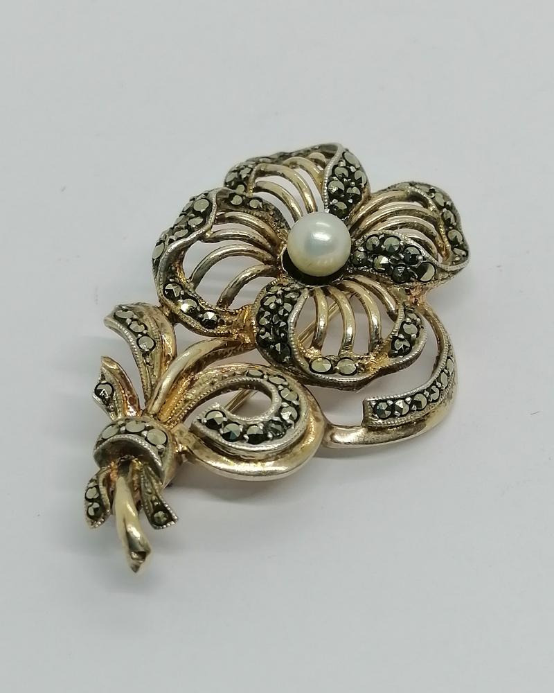 Broche monture en argent/vermeil massif, fleur stylisée et ajourée en volume, avec en parties en sertie grains des pavages de marcasites naturelles et facettées, finitions en frises perlées, au centre de la fleur, une perle naturelle de culture ronde et de couleur blanche, système fermoir à pompe sécurisée, travail Allemand vers 1930, Art Déco.