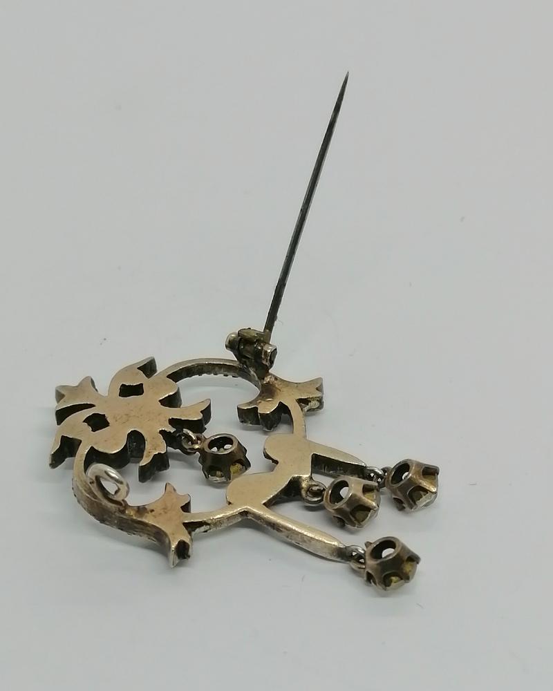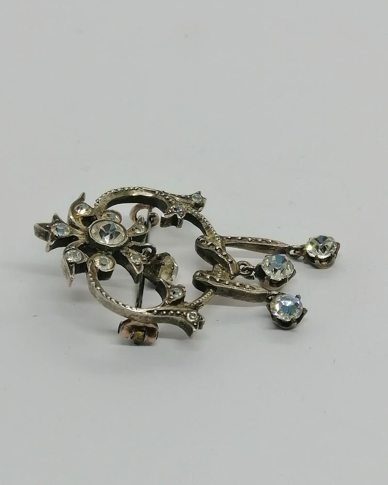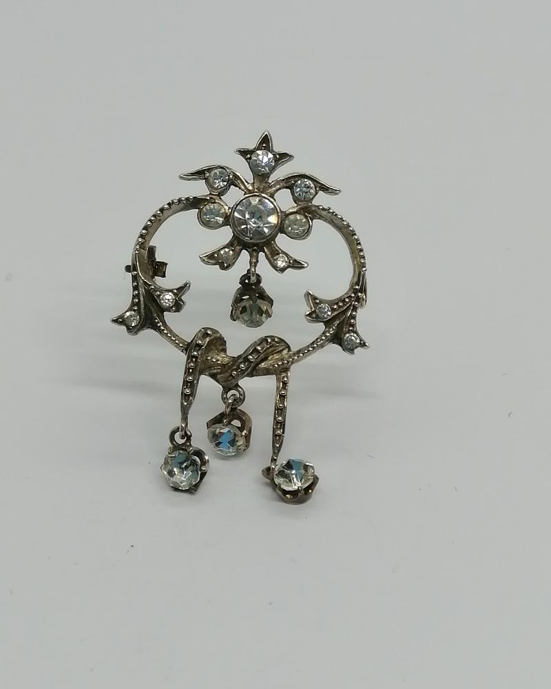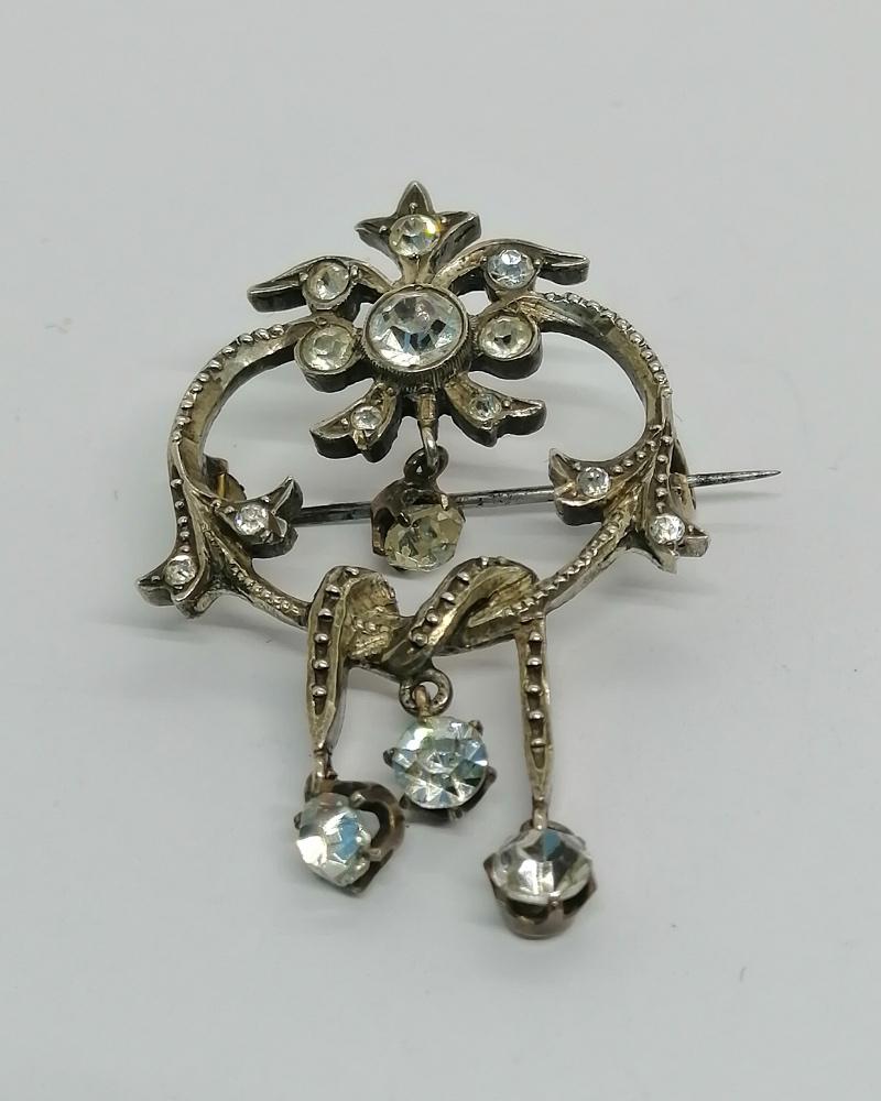 Broche argent/vermeil rosé à l’arrière , pampilles et strass blanc, 1880-1900.