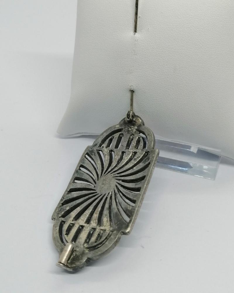Broche monture en métal blanc, un peu couleur étain à l'arrière, de forme géométrique et ajourée, très légèrement galbée, avec pavage en sertie grains, de strass blanc facettés de très belle couleur, façon diamants, trois plus important en ligne, le tout en finition de frises perlées, très beau travail ancien, Européen Art Déco, vers 1930, celle-ci fait aussi son effet.