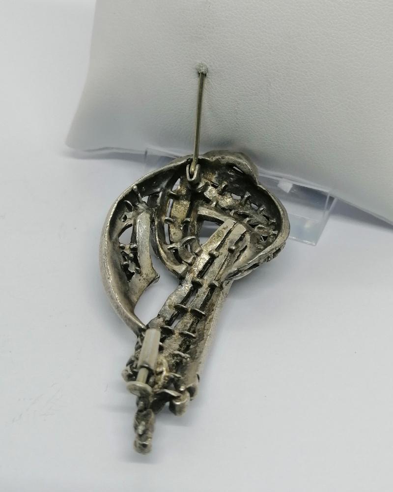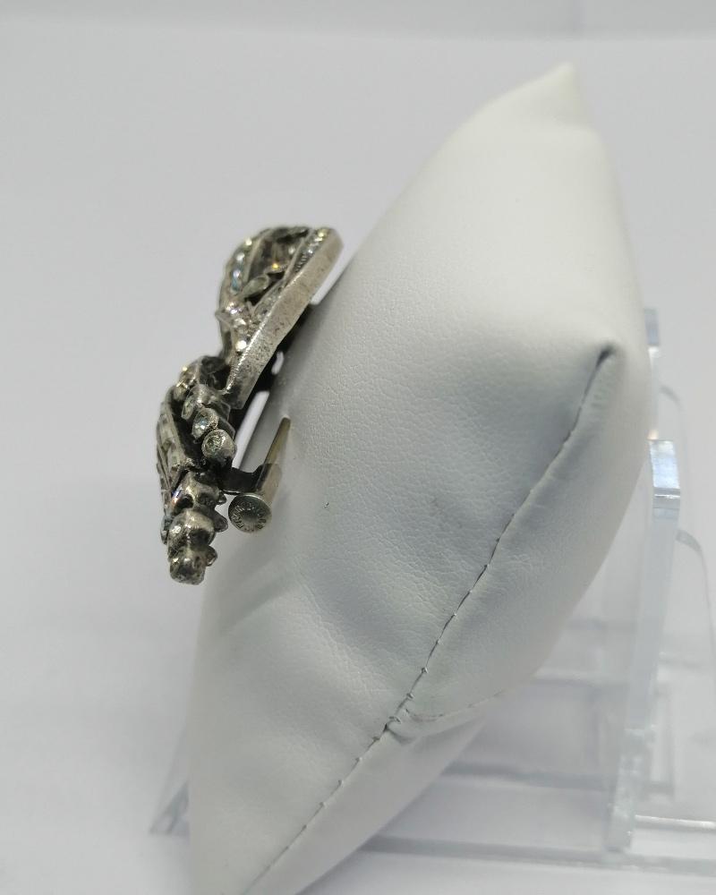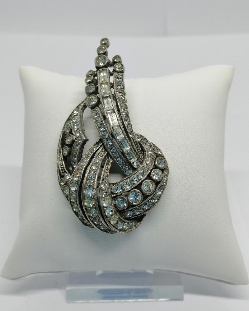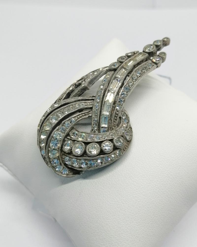 Broche monture métal blanc, façon étain argenté à l'arrière, d'un beau volume bombé, entièrement pavée de strass blanc facettés lumineux en brillance, de forme rond et baguette, le tout avec finition frises perlées, système fermoir à pompe sécurisé, travail Européen, vers 1930, Art Déco, beau bijou typé.