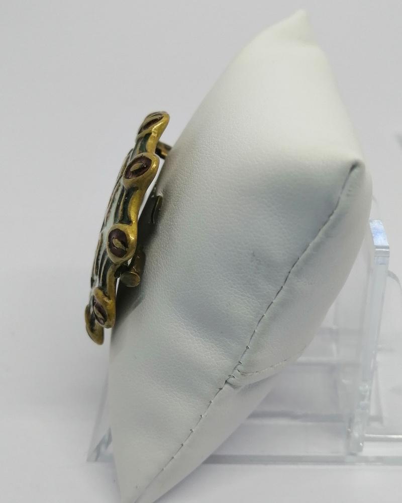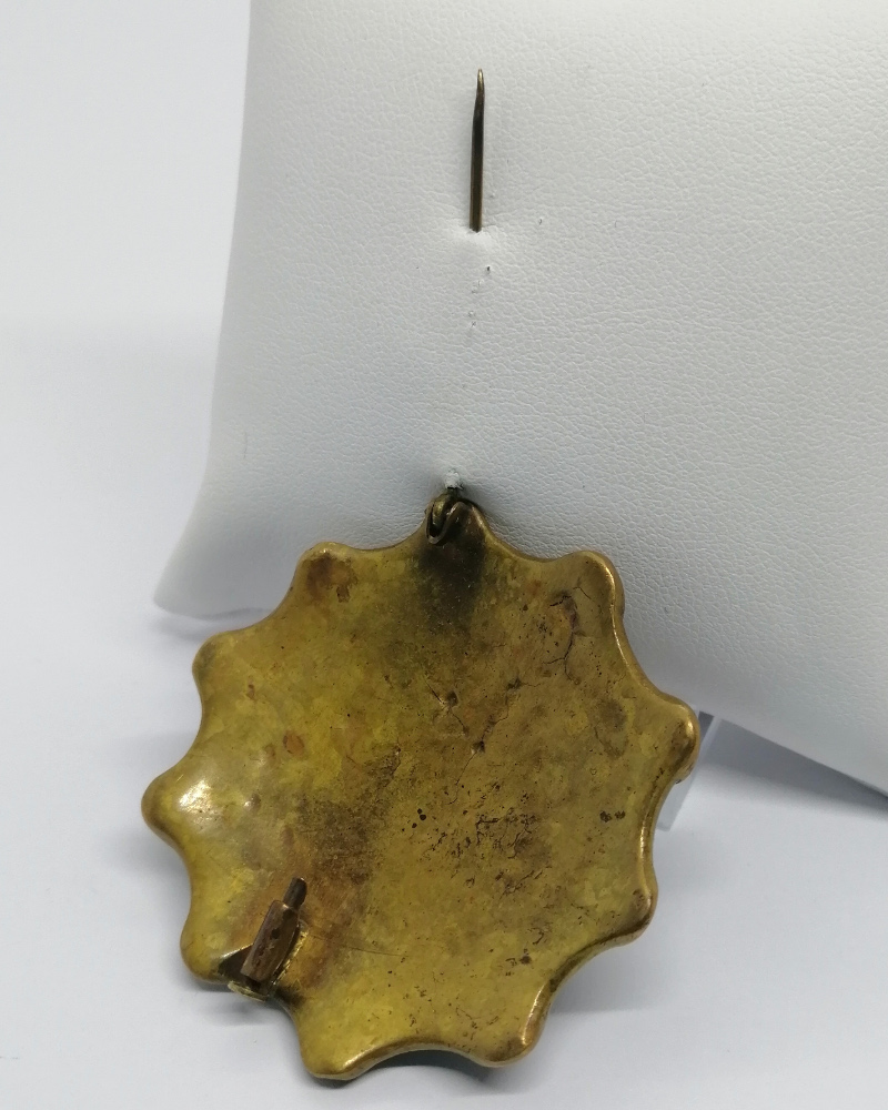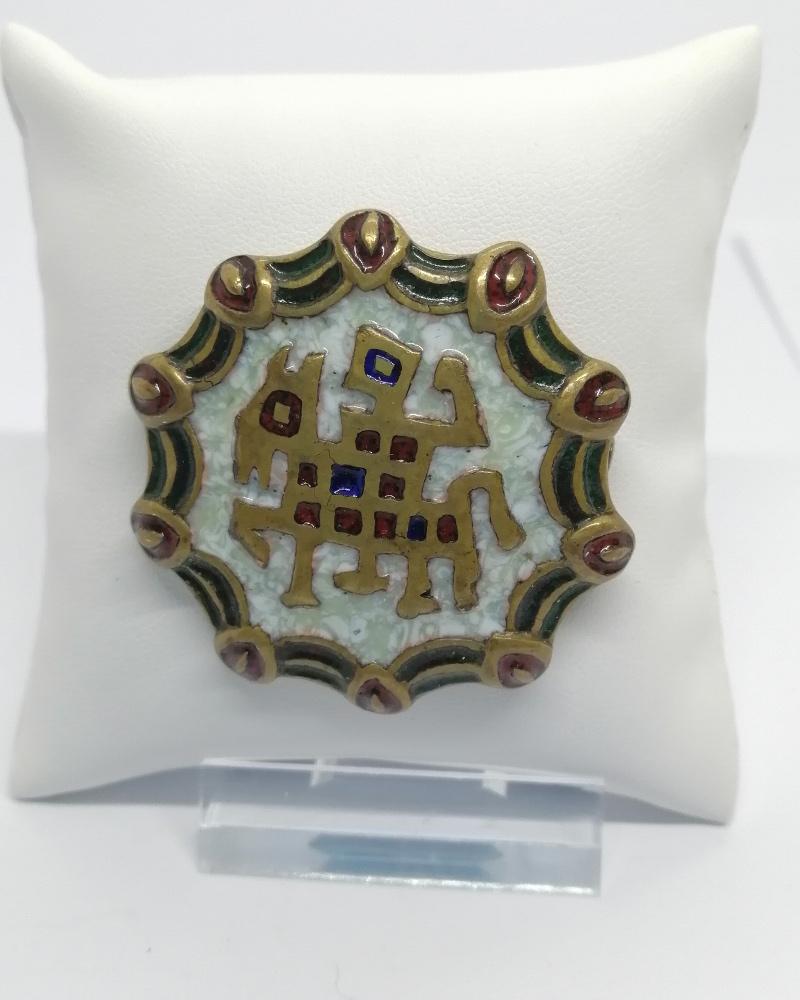 Broche monture en bronze, en forme de fleurette et légèrement galbée, avec décor cloisonné en émail de différentes couleurs, représentant une frise autour et un personnage à cheval, fait penser à Don Quichotte, système fermoir à pompe sécurisé, travail Européen, vers 1920-30, peu courant, fait son poids.