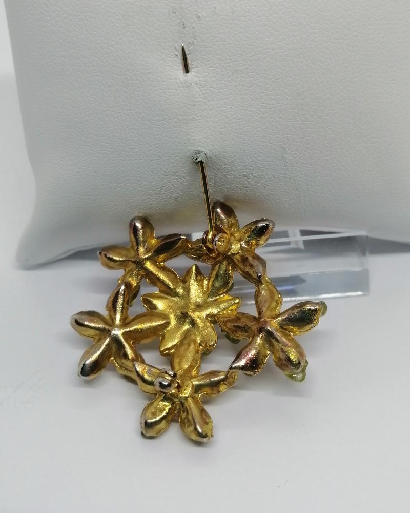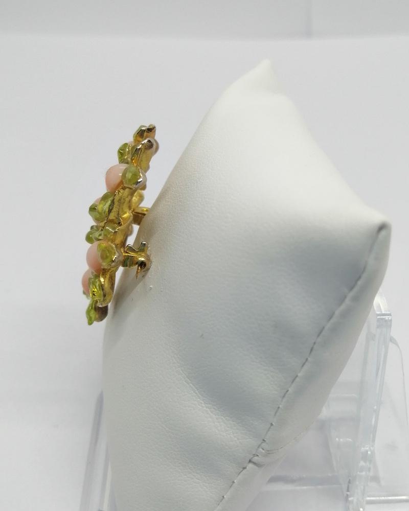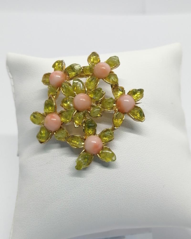 Broche monture en laiton jaune, en forme de fleur ou de branchage, avec sur l'ensemble des morceaux de pâte de verre de couleur verte, et aussi des cabochons de verre imitant du corail, système fermoir à goupillon sécurisé, travail Européen vers 1980-90.