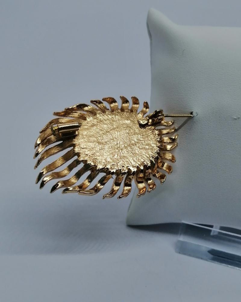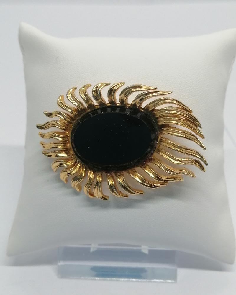 Broche monture en laiton jaune, façonnée comme un soleil ou une flamme, avec au centre une plaque de verre noir et de forme ovale, système fermoir à pompe sécurisé, travail Européen, vers 1940-50.