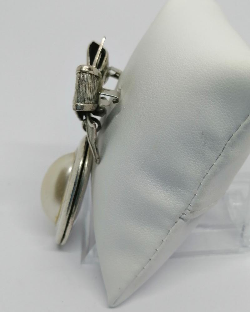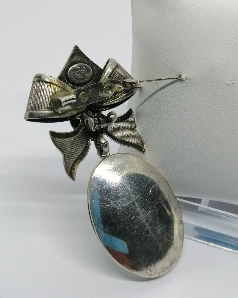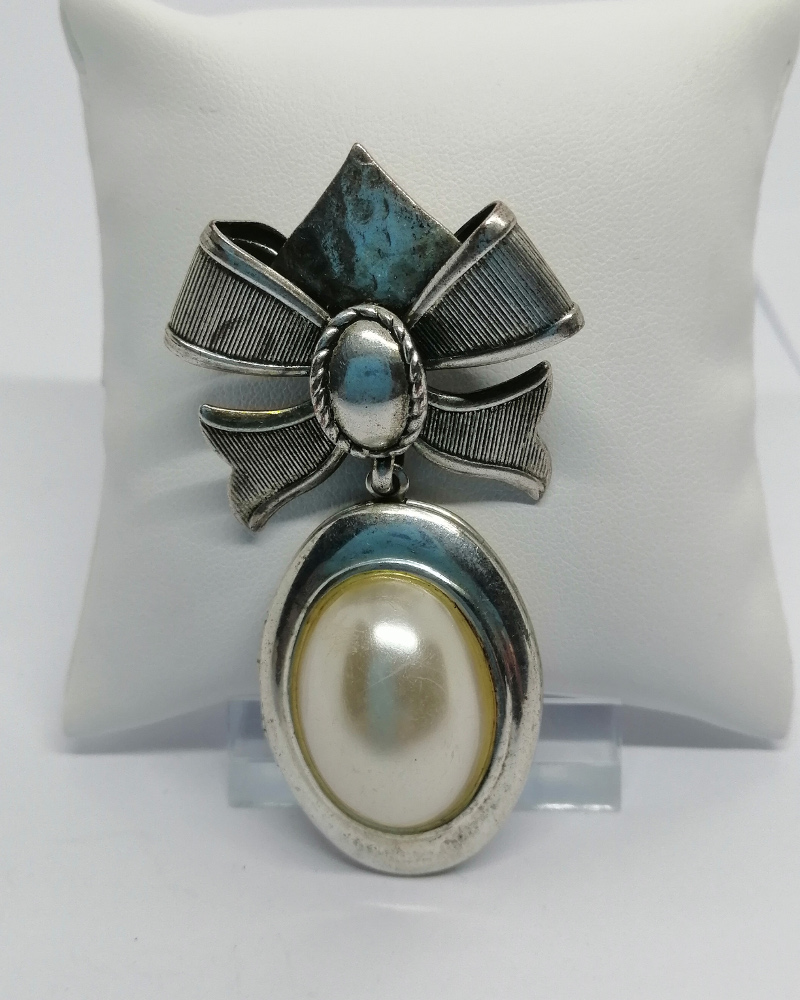 Broche en métal blanc, représentant un gros noeud avec stries, et en grosse pampille, une cassolette sur charnière ouvrante porte-photo, fermeture par pression avec devant une grosse perle d'imitation, signé Zoé Coste, vers 1980-90, système fermoir clip remplacer pas système épingle sans sécurité, travail Français, original document joint.